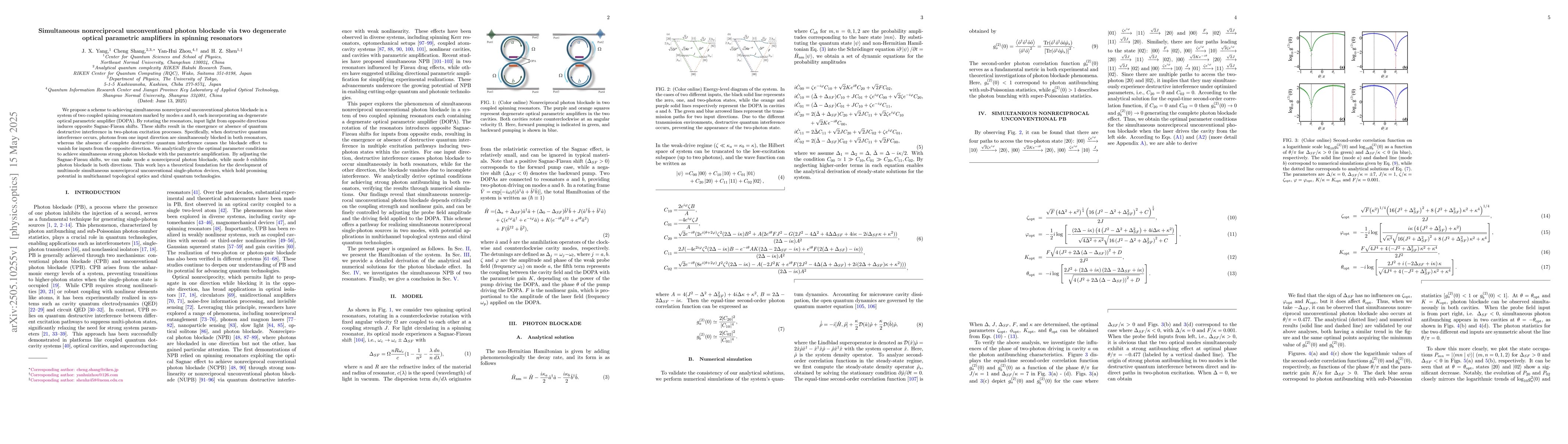 The research proposes a scheme using two coupled spinning resonators, each containing a degenerate optical parametric amplifier (DOPA), to achieve simultaneous nonreciprocal unconventional photon blockade.