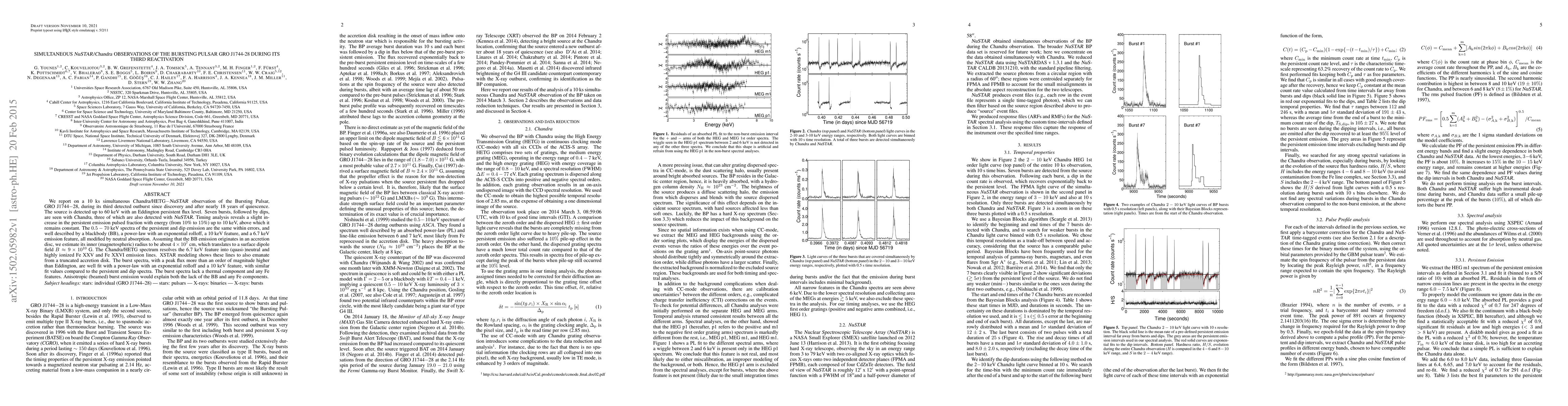 We report on a 10 ks simultaneous Chandra/HETG-NuSTAR observation of the Bursting Pulsar, GRO J1744-28, during its third detected outburst since discovery and after nearly 18 years of quiescence. The source is detected up to 60 keV with an Eddington persistent flux level. Seven bursts, followed by dips, are seen with Chandra, three of which are also detected with NuSTAR. Timing analysis reveals a slight increase in the persistent emission pulsed fraction with energy (from 10% to 15%) up to 10 keV, above which it remains constant. The 0.5-70 keV spectra of the persistent and dip emission are the same within errors, and well described by a blackbody (BB), a power-law with an exponential rolloff, a 10 keV feature, and a 6.7 keV emission feature, all modified by neutral absorption. Assuming that the BB emission originates in an accretion disc, we estimate its inner (magnetospheric) radius to be about 4x10^7 cm, which translates to a surface dipole field B~9x10^10 G. The Chandra/HETG spectrum resolves the 6.7 keV feature into (quasi-)neutral and highly ionized Fe XXV and Fe XXVI emission lines. XSTAR modeling shows these lines to also emanate from a truncated accretion disk. The burst spectra, with a peak flux more than an order of magnitude higher than Eddington, are well fit with a power-law with an exponential rolloff and a 10~keV feature, with similar fit values compared to the persistent and dip spectra. The burst spectra lack a thermal component and any Fe features. Anisotropic (beamed) burst emission would explain both the lack of the BB and any Fe components.