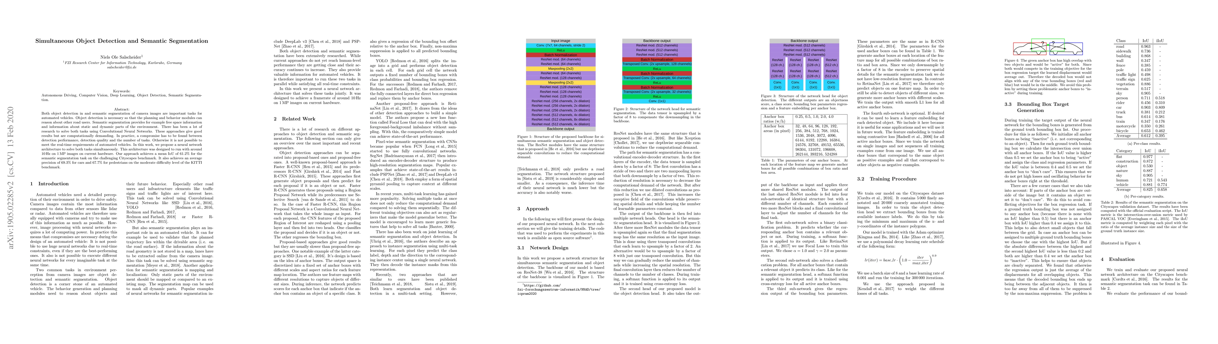 This paper proposes a neural network architecture to simultaneously perform object detection and semantic segmentation for automated vehicles, achieving a mean IoU of 61.2% on Cityscapes and an average precision of 69.3% for cars on KITTI, all while maintaining real-time performance at around 10 Hz on 1 MP images.