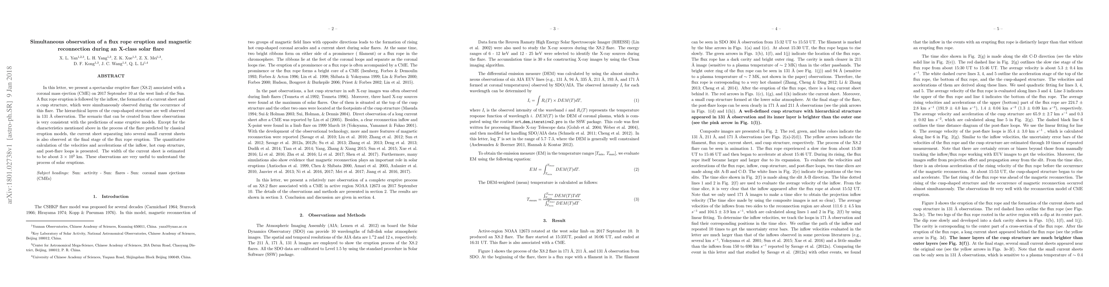 This paper presents simultaneous observations of a flux rope eruption and magnetic reconnection during an X8.2 solar flare, revealing a current sheet formation and cusp structure, consistent with eruptive models. The study also quantifies velocities and estimates the current sheet's width, enhancing understanding of solar eruption processes.