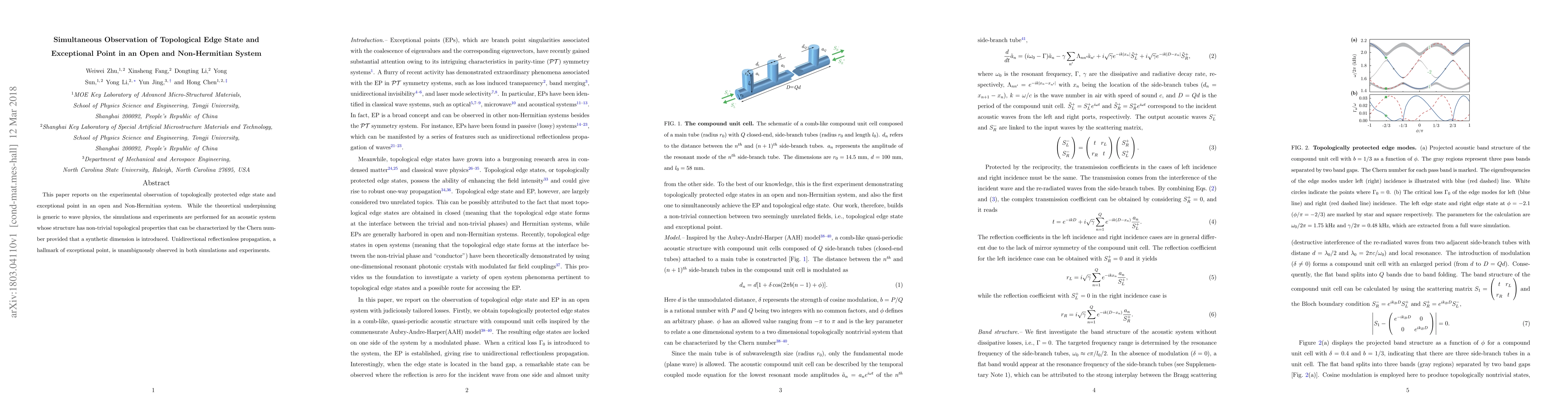 This paper reports on the simultaneous observation of topological edge states and exceptional points in an open, non-Hermitian acoustic system, demonstrating unidirectional, reflectionless propagation and topological properties characterized by the Chern number.