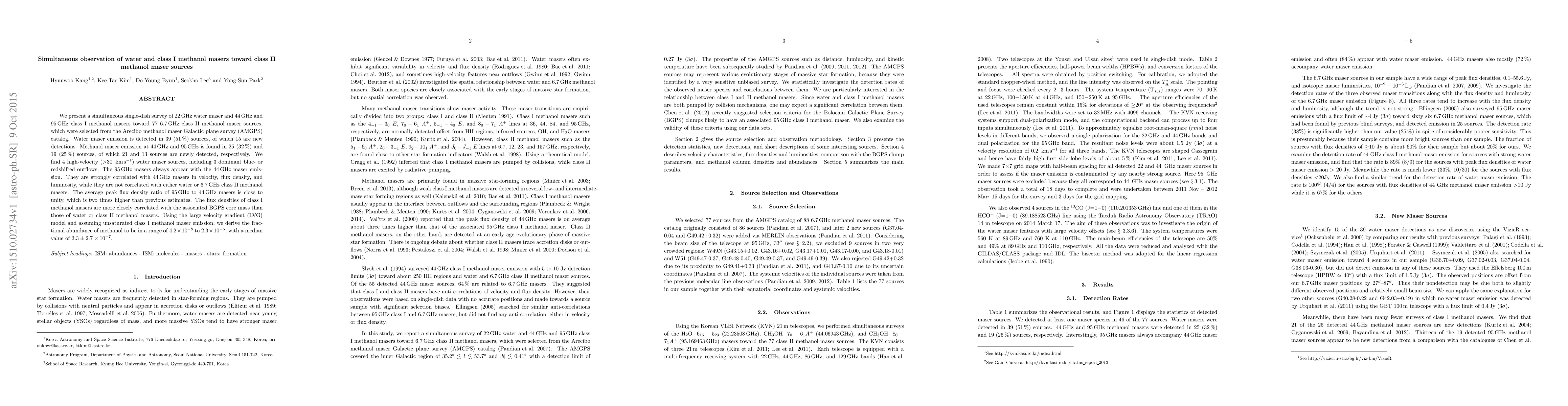 We present a simultaneous single-dish survey of 22 GHz water maser and 44 GHz and 95 GHz class I methanol masers toward 77 6.7 GHz class II methanol maser sources, which were selected from the Arecibo methanol maser Galactic plane survey (AMGPS) catalog.Water maser emission is detected in 39 (51%) sources, of which 15 are new detections. Methanol maser emission at 44 GHz and 95 GHz is found in 25 (32%) and 19 (25%) sources, of which 21 and 13 sources are newly detected, respectively. We find 4 high-velocity (> 30 km/s) water maser sources, including 3 dominant blue- or redshifted outflows.The 95 GHz masers always appear with the 44 GHz maser emission. They are strongly correlated with 44 GHz masers in velocity, flux density, and luminosity, while they are not correlated with either water or 6.7 GHz class II methanol masers. The average peak flux density ratio of 95 GHz to 44 GHz masers is close to unity, which is two times higher than previous estimates. The flux densities of class I methanol masers are more closely correlated with the associated BGPS core mass than those of water or class II methanol masers. Using the large velocity gradient (LVG) model and assuming unsaturated class I methanol maser emission, we derive the fractional abundance of methanol to be in a range of 4.2*10^-8 to 2.3*10^-6, with a median value of 3.3\pm2.7*10^-7.