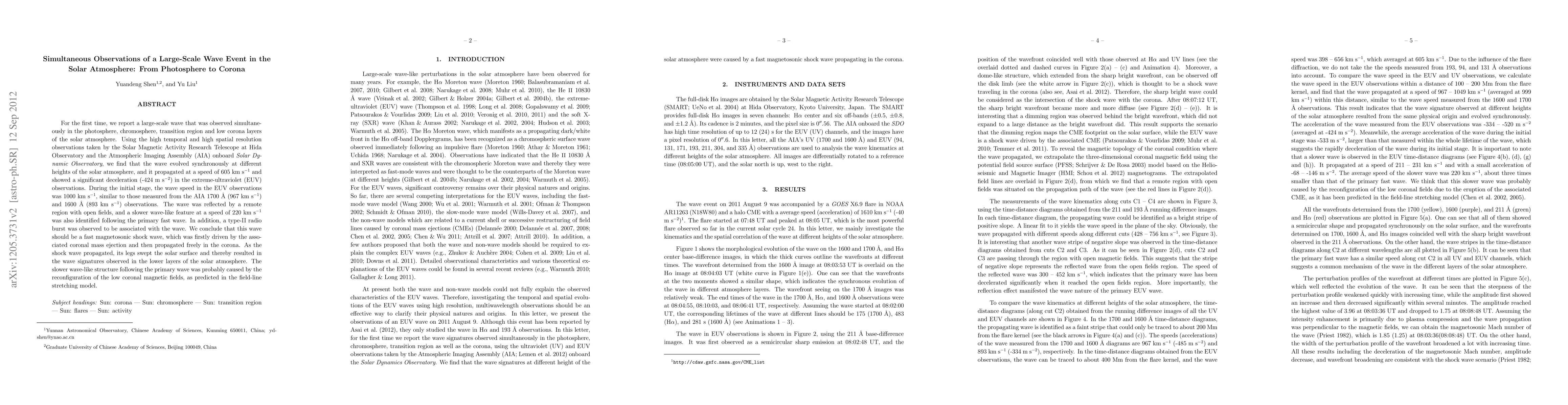 For the first time, we report a large-scale wave that was observed simultaneously in the photosphere, chromosphere, transition region and low corona layers of the solar atmosphere. Using the high temporal and high spatial resolution observations taken by the Solar Magnetic Activity Research Telescope at Hida Observatory and the Atmospheric Imaging Assembly (AIA) onboard Solar Dynamic Observatory, we find that the wave evolved synchronously at different heights of the solar atmosphere, and it propagated at a speed of 605 km/s and showed a significant deceleration (-424 m/s2) in the extreme-ultraviolet (EUV) observations. During the initial stage, the wave speed in the EUV observations was 1000 km/s, similar to those measured from the AIA 1700 {\AA} (967 km/s) and 1600 {\AA} (893 km/s) observations. The wave was reflected by a remote region with open fields, and a slower wave-like feature at a speed of 220 km/s was also identified following the primary fast wave. In addition, a type-II radio burst was observed to be associated with the wave. We conclude that this wave should be a fast magnetosonic shock wave, which was firstly driven by the associated coronal mass ejection and then propagated freely in the corona. As the shock wave propagated, its legs swept the solar surface and thereby resulted in the wave signatures observed in the lower layers of the solar atmosphere. The slower wave-like structure following the primary wave was probably caused by the reconfiguration of the low coronal magnetic fields, as predicted in the field-line stretching model.