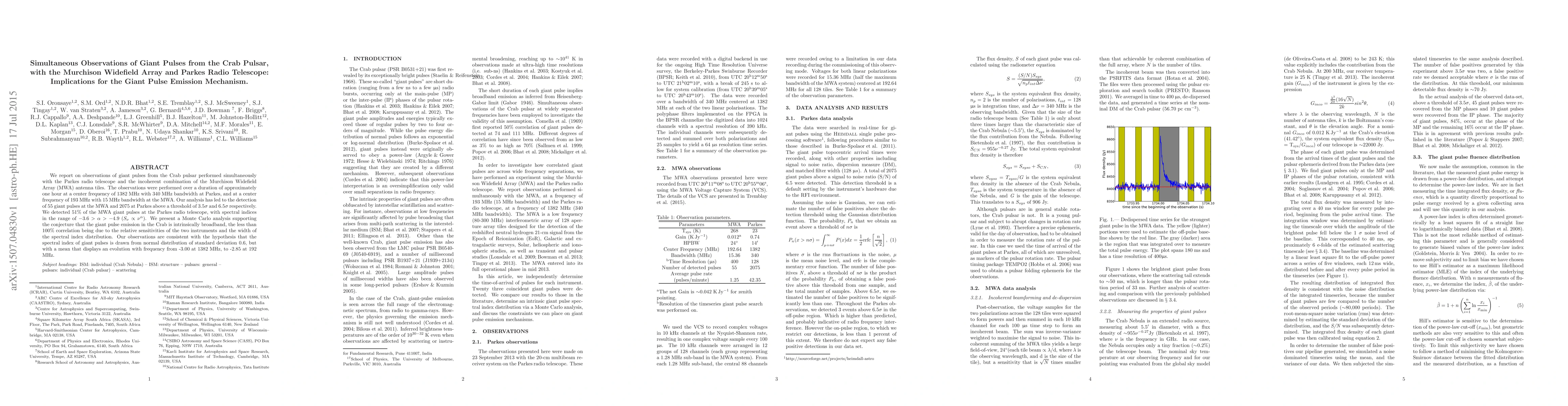This study reports simultaneous observations of giant pulses from the Crab pulsar using the Murchison Widefield Array and the Parkes Radio Telescope, detecting 55 and 2075 pulses respectively. The findings suggest that the emission mechanism is intrinsically broadband, with spectral indices varying from -3.6 to -4.9, and a normal distribution with a standard deviation of 0.6.