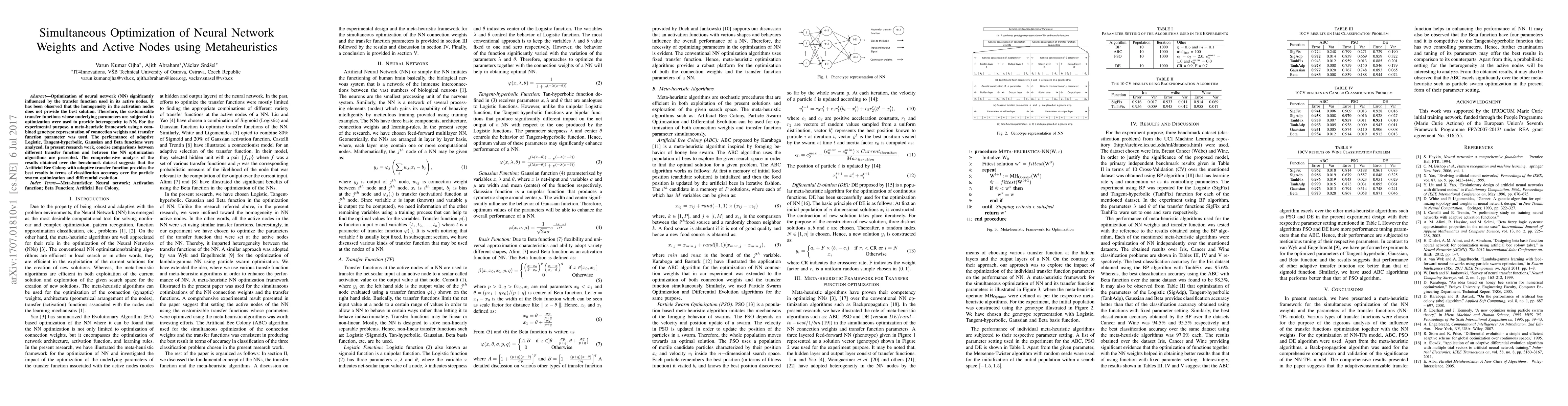 Optimization of neural network (NN) significantly influenced by the transfer function used in its active nodes. It has been observed that the homogeneity in the activation nodes does not provide the best solution. Therefore, the customizable transfer functions whose underlying parameters are subjected to optimization were used to provide heterogeneity to NN. For the experimental purpose, a meta-heuristic framework using a combined genotype representation of connection weights and transfer function parameter was used. The performance of adaptive Logistic, Tangent-hyperbolic, Gaussian and Beta functions were analyzed. In present research work, concise comparisons between different transfer function and between the NN optimization algorithms are presented. The comprehensive analysis of the results obtained over the benchmark dataset suggests that the Artificial Bee Colony with adaptive transfer function provides the best results in terms of classification accuracy over the particle swarm optimization and differential evolution.