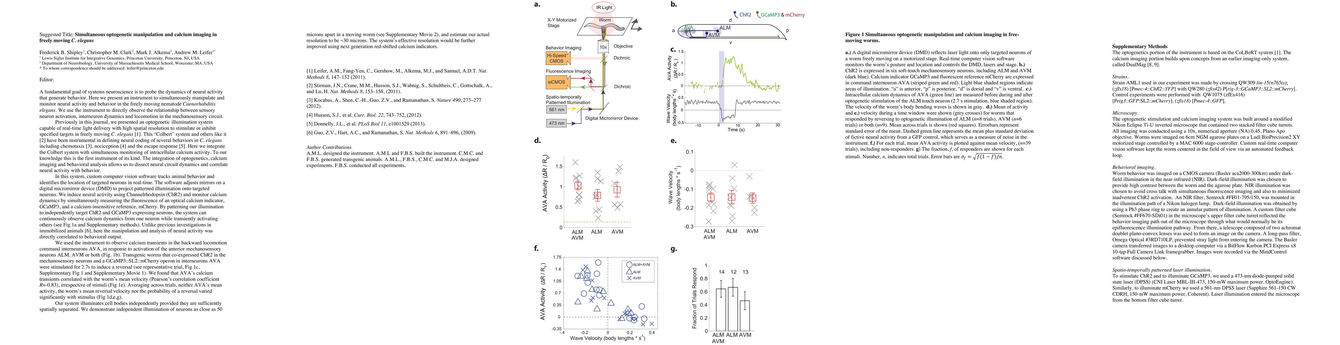 A fundamental goal of systems neuroscience is to probe the dynamics of neural activity that drive behavior. Here we present an instrument to simultaneously manipulate neural activity via Channelrhodopsin, monitor neural response via GCaMP3, and observe behavior in freely moving C. elegans. We use the instrument to directly observe the relation between sensory stimuli, interneuron activity and locomotion in the mechanosensory circuit.