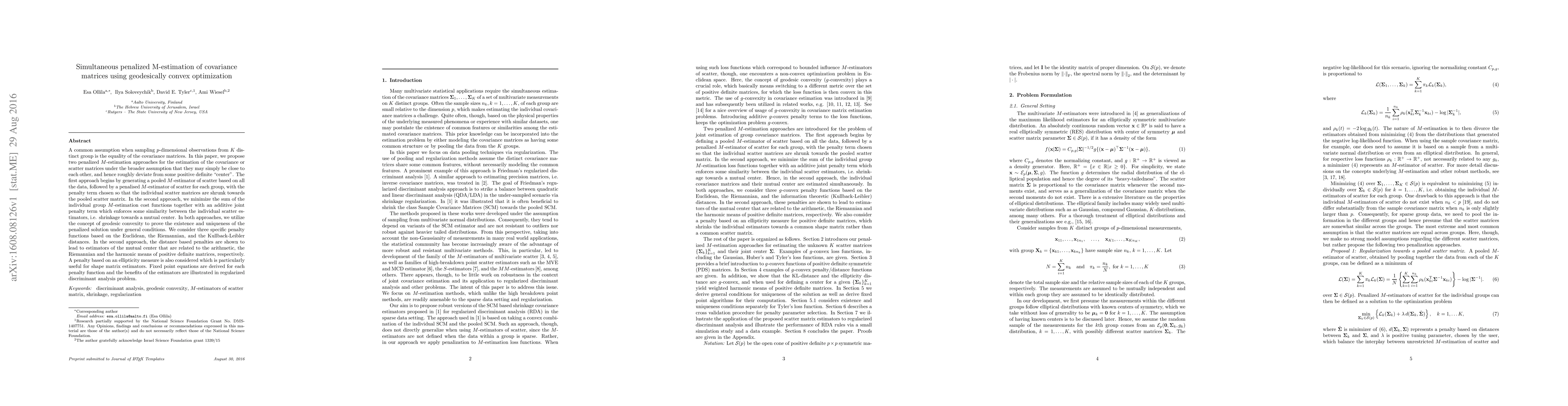 This paper proposes two penalized M-estimation methods for estimating covariance matrices when the assumption of equal covariance matrices may not hold. It utilizes geodesic convex optimization to shrink individual group scatter matrices towards a pooled center, with penalties based on Euclidean, Riemannian, and Kullback-Leibler distances.