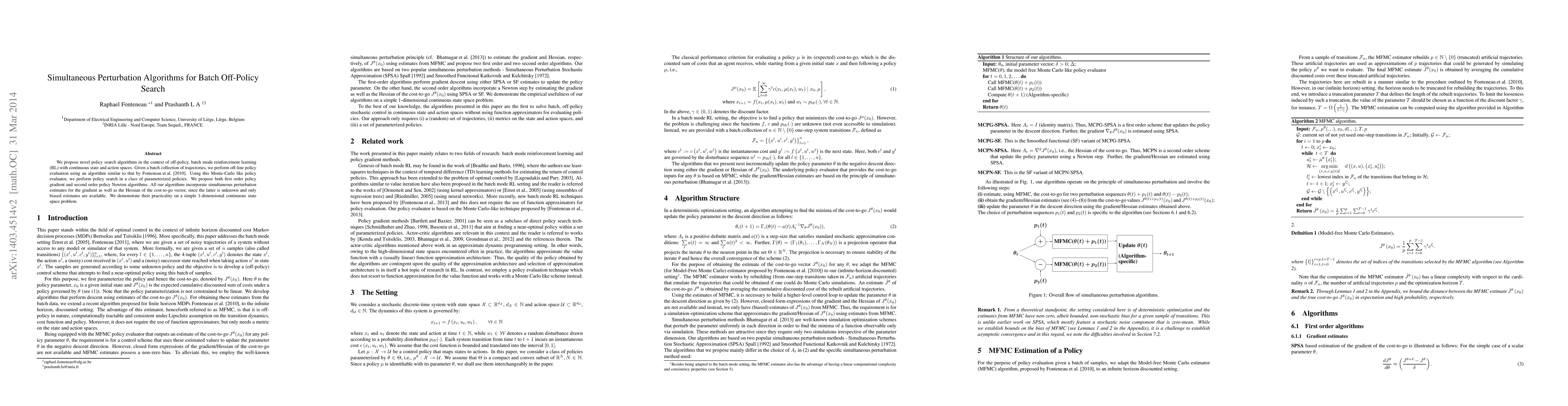 This paper introduces novel simultaneous perturbation algorithms for off-policy batch mode reinforcement learning, proposing both first and second-order policy gradient methods. It employs Monte-Carlo policy evaluation and uses simultaneous perturbation techniques to estimate gradients and Hessians for policy search.