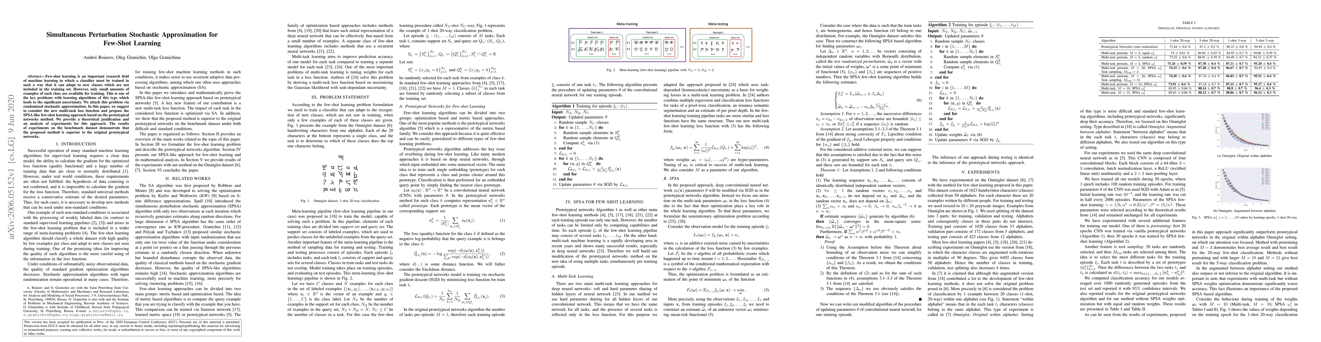 Few-shot learning is an important research field of machine learning in which a classifier must be trained in such a way that it can adapt to new classes which are not included in the training set. However, only small amounts of examples of each class are available for training. This is one of the key problems with learning algorithms of this type which leads to the significant uncertainty. We attack this problem via randomized stochastic approximation. In this paper, we suggest to consider the new multi-task loss function and propose the SPSA-like few-shot learning approach based on the prototypical networks method. We provide a theoretical justification and an analysis of experiments for this approach. The results of experiments on the benchmark dataset demonstrate that the proposed method is superior to the original prototypical networks.