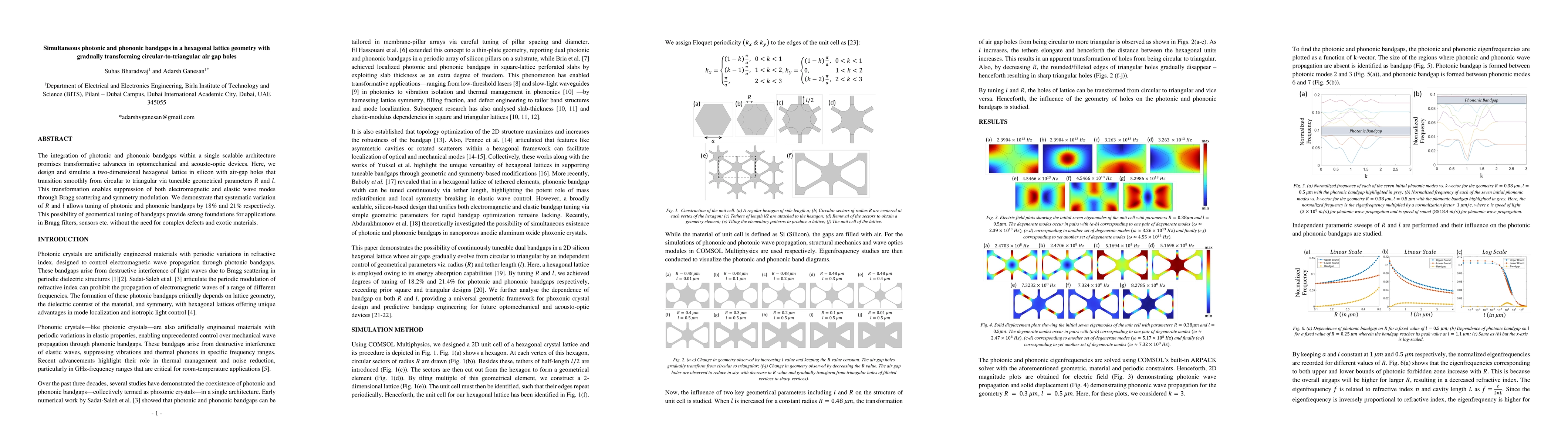 The integration of photonic and phononic bandgaps within a single scalable architecture promises transformative advances in optomechanical and acousto-optic devices. Here, we design and simulate a two-dimensional hexagonal lattice in silicon with air-gap holes that transition smoothly from circular to triangular via tuneable geometrical parameters R and l. This transformation enables suppression of both electromagnetic and elastic wave modes through Bragg scattering and symmetry modulation. We demonstrate that systematic variation of R and l allows tuning of photonic and phononic bandgaps by 18% and 21% respectively. This possibility of geometrical tuning of bandgaps provide strong foundations for applications in Bragg filters, sensors etc. without the need for complex defects and exotic materials.