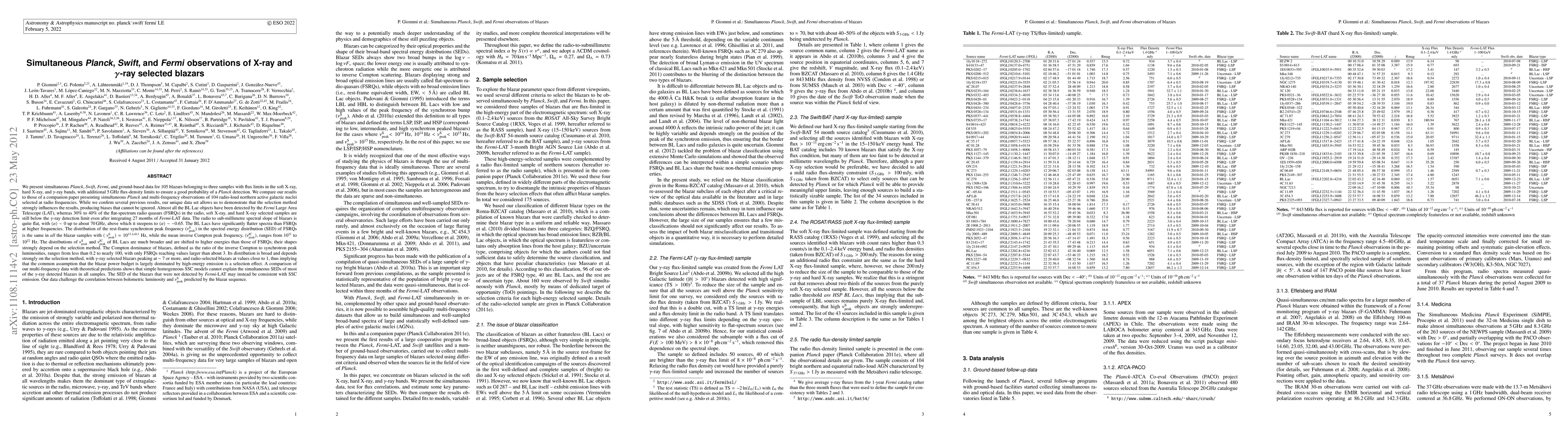 This paper analyzes simultaneous observations of 105 blazars across X-ray and gamma-ray bands using Planck, Swift, Fermi, and ground-based data, revealing significant biases due to selection methods. The study finds that BL Lac objects are more detectable by Fermi-LAT, while many flat-spectrum radio quasars remain undetected in gamma rays, indicating a strong dependence of blazar properties on selection criteria.