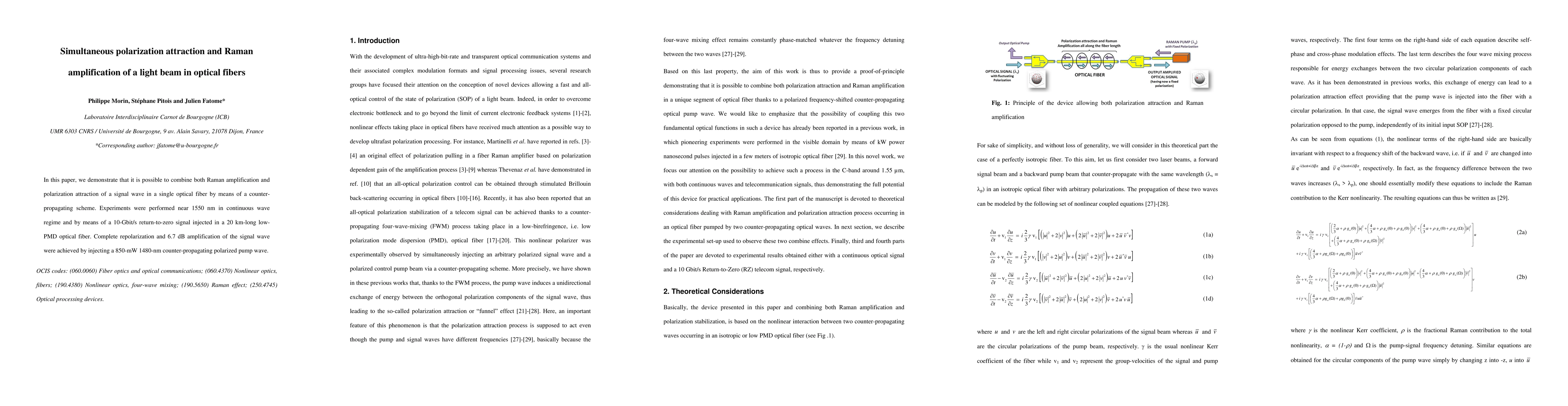 In this paper, we demonstrate that it is possible to combine both Raman amplification and polarization attraction of a signal wave in a single optical fiber by means of a counterpropagating scheme. Experiments were performed near 1550 nm in a continuous wave regime and by means of a 10 Gbit / s return-to-zero signal injected in a 20 kmlong low polarization mode dispersion optical fiber. Complete repolarization and 6.7 dB amplification of the signal wave was achieved by injecting a 850 mW, 1480 nm counterpropagating polarized pump wave.