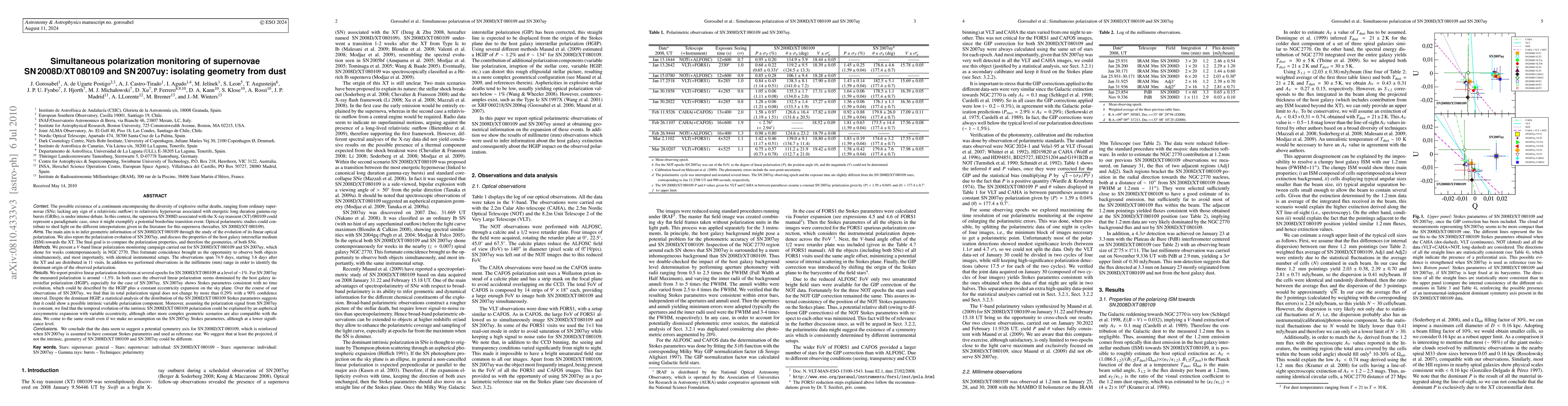 The possible existence of a continuum encompassing the diversity of explosive stellar deaths,ranging from ordinary SNe to relativistic hypernovae associated with long duration GRBs, is under intense debate. In this context, SN2008D associated with XT080109 could represent a paradigmatic case, since it might exemplify a potential borderline event. The main aim is to infer geometric information of SN2008D through the evolution of its linear optical polarization. We also report the polarization evolution of SN2007uy, and discuss the properties of the host ISM towards the XT. The final goal is to compare the polarization properties, and hence the geometries of both SNe, which shone contemporaneously in NGC2770. This fortunate coincidence brought us the opportunity to observe both SNe simultaneously, and most importantly, with identical instrumental setups. The observations span 74.9 days, starting 3.6 days after the XT and are distributed in 11 visits. In addition we performed observations in the mm range in order to identify the dominant polarization. We report positive linear polarization detections at several epochs for SN2008D at a level of ~1% and at ~1.5% for SN2007uy. SN2007uy shows constant polarization, which could be described by the host interstellar polarization plus a constant eccentricity expansion on the sky plane. A statistical analysis of the distribution of the SN2008D Stokes parametres suggests that it could show an intrinsic variable polarization component. Assuming the SN2007uy polarization is constant, we find that the evolution of the intrinsic SN2008D polarization could be explained by an aspherical axisymmetric expansion with variable eccentricity. We come to the same result even if we make no assumption on SN2007uy, although at a lower significance level. We suggest that at least the projected, if not the intrinsic, geometries of both SNe could differ.