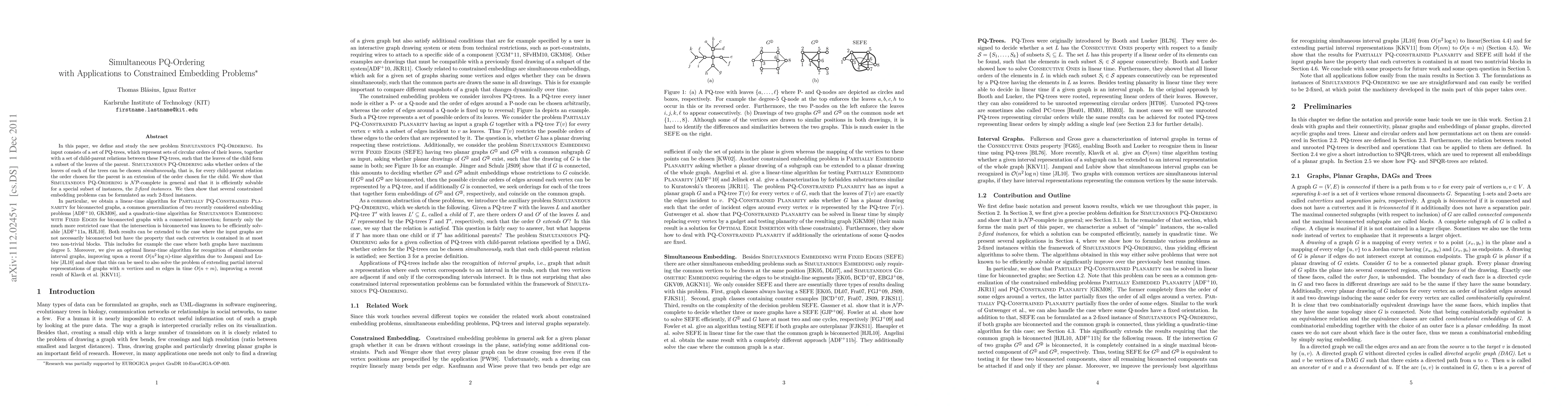 In this paper, we define and study the new problem Simultaneous PQ-Ordering. Its input consists of a set of PQ-trees, which represent sets of circular orders of their leaves, together with a set of child-parent relations between these PQ-trees, such that the leaves of the child form a subset of the leaves of the parent. Simultaneous PQ-Ordering asks whether orders of the leaves of each of the trees can be chosen simultaneously, that is, for every child-parent relation the order chosen for the parent is an extension of the order chosen for the child. We show that Simultaneous PQ-Ordering is NP-complete in general and that it is efficiently solvable for a special subset of instances, the 2-fixed instances. We then show that several constrained embedding problems can be formulated as such 2-fixed instances. In particular, we obtain a linear-time algorithm for Partially PQ-Constrained Planarity for biconnected graphs, a common generalization of two recently considered embedding problems, and a quadratic-time algorithm for Simultaneous Embedding with Fixed Edges for biconnected graphs with a connected intersection; formerly only the much more restricted case that the intersection is biconnected was known to be efficiently solvable. Both results can be extended to the case where the input graphs are not necessarily biconnected but have the property that each cutvertex is contained in at most two non-trivial blocks. This includes for example the case where both graphs have maximum degree 5. Moreover, we give an optimal linear-time algorithm for recognition of simultaneous interval graphs, improving upon a recent O(n^2 log n)-time algorithm due to Jampani and Lubiw and show that this can be used to also solve the problem of extending partial interval representations of graphs with n vertices and m edges in time O(n + m), improving a recent result of Klav\'ik et al.