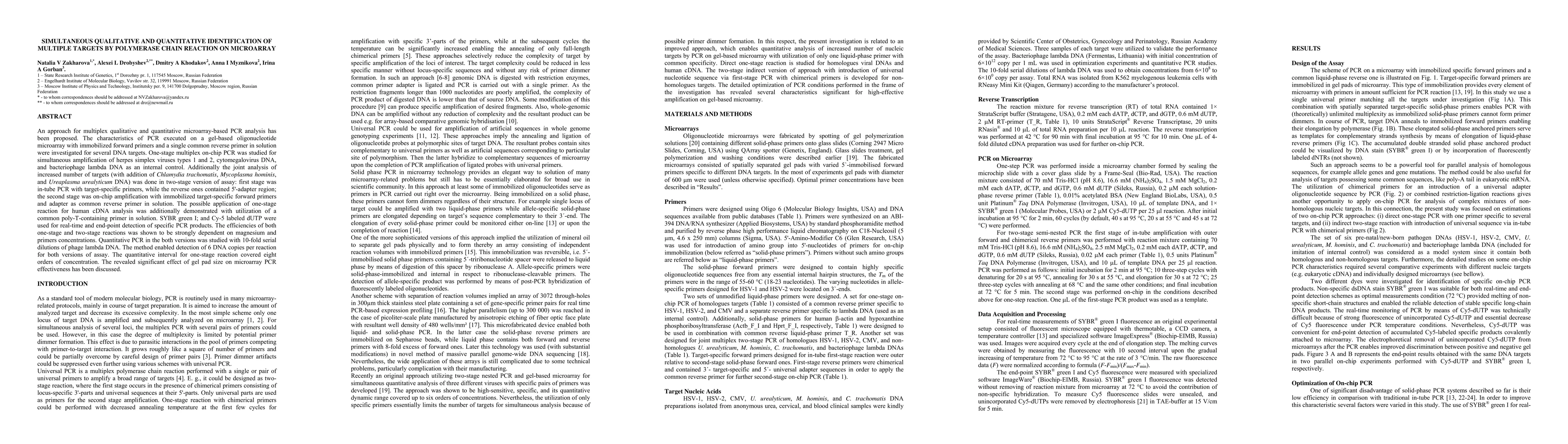 An approach for multiplex qualitative and quantitative microarray-based PCR analysis has been proposed. The characteristics of PCR executed on a gel-based oligonucleotide microarray with immobilized forward primers and a single common reverse primer in solution were investigated for several DNA targets. One-stage multiplex on-chip PCR was studied for simultaneous amplification of herpes simplex viruses types 1 and 2, cytomegalovirus DNA, and bacteriophage lambda DNA as an internal control. Additionally the joint analysis of increased number of targets (with addition of Chlamydia trachomatis, Mycoplasma hominis, and Ureaplasma urealyticum DNA) was done in two-stage version of assay: first stage was in-tube PCR with target-specific primers, while the reverse ones contained 5'-adapter region; the second stage was on-chip amplification with immobilized target-specific forward primers and adapter as common reverse primer in solution. The possible application of one-stage reaction for human cDNA analysis was additionally demonstrated with utilization of a common poly-T-containing primer in solution. SYBR green I; and Cy-5 labeled dUTP were used for real-time and end-point detection of specific PCR products. The efficiencies of both one-stage and two-stage reactions was shown to be strongly dependent on magnesium and primers concentrations. Quantitative PCR in the both versions was studied with 10-fold serial dilutions of phage lambda DNA. The method enabled detection of 6 DNA copies per reaction for both versions of assay. The quantitative interval for one-stage reaction covered eight orders of concentration. The revealed significant effect of gel pad size on microarray PCR effectiveness has been discussed.