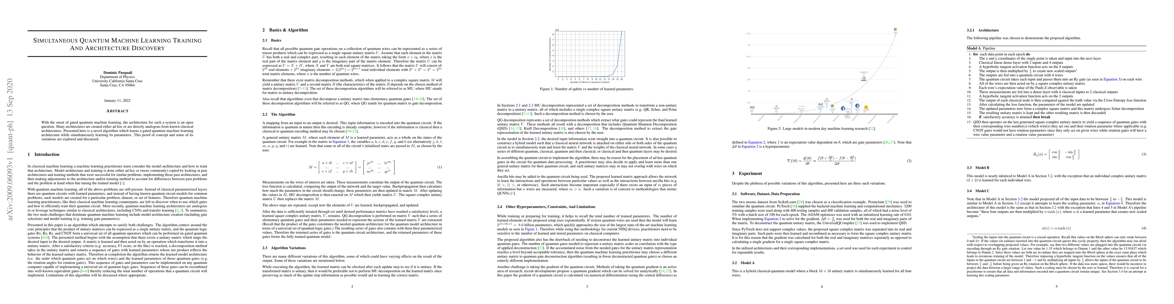 This paper introduces a novel algorithm for simultaneously discovering the architecture and training parameters of gated quantum machine learning systems, offering a proof of concept and exploring its variations. The approach aims to address the open question of optimal quantum machine learning architecture design.