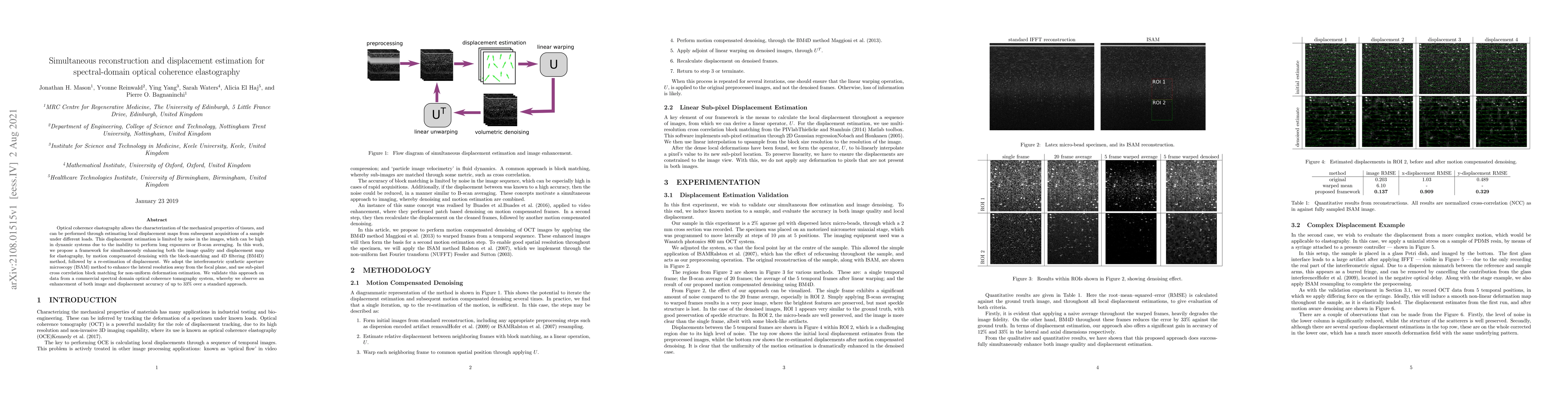 This paper proposes a framework for simultaneous image quality enhancement and displacement map estimation in spectral-domain optical coherence elastography using motion compensated denoising and re-estimation techniques, achieving up to a 33% improvement over standard methods. The approach combines block-matching and 4D filtering with interferometric synthetic aperture microscopy for better resolution and sub-pixel cross-correlation for non-uniform deformation.