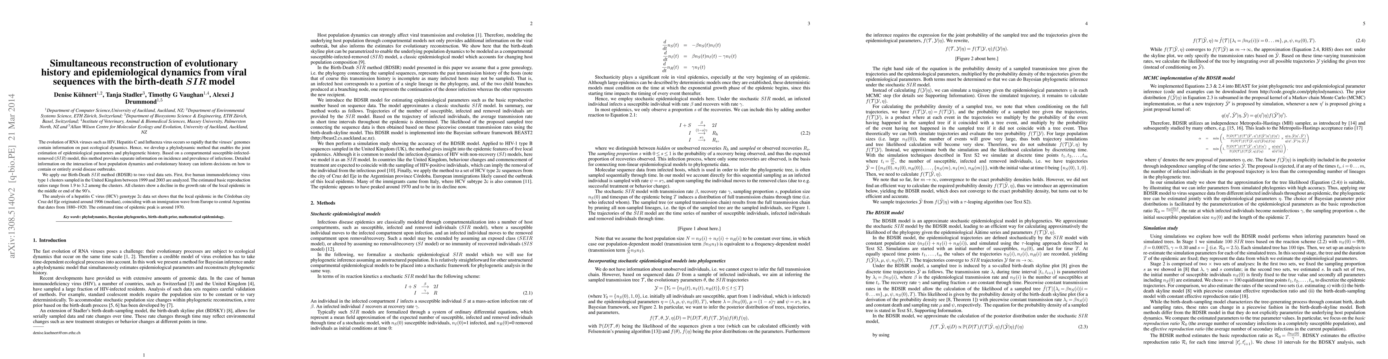 This paper introduces a phylodynamic method combining epidemiological and phylogenetic data to reconstruct the evolutionary history and dynamics of RNA viruses like HIV and Hepatitis C. The Birth-Death SIR model (BDSIR) estimates epidemiological parameters and phylogenetic history, revealing interactions between host population dynamics and viral evolution to inform outbreak containment strategies.