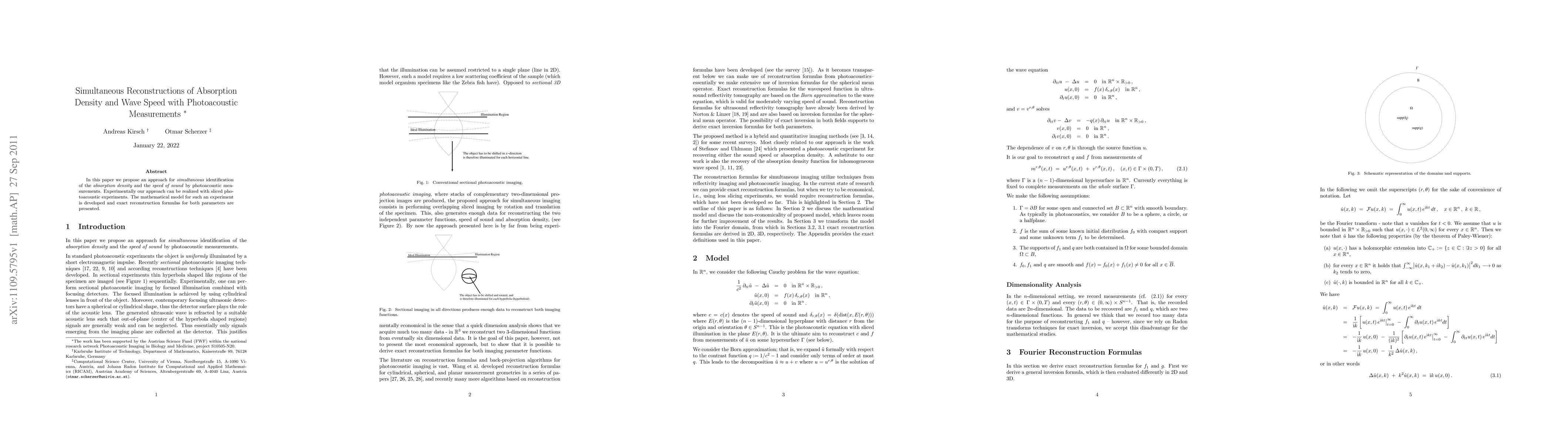 In this paper we propose an approach for \emph{simultaneous} identification of the \emph{absorption density} and the \emph{speed of sound} by photoacoustic measurements. Experimentally our approach can be realized with sliced photoacoustic experiments. The mathematical model for such an experiment is developed and exact reconstruction formulas for both parameters are presented.
