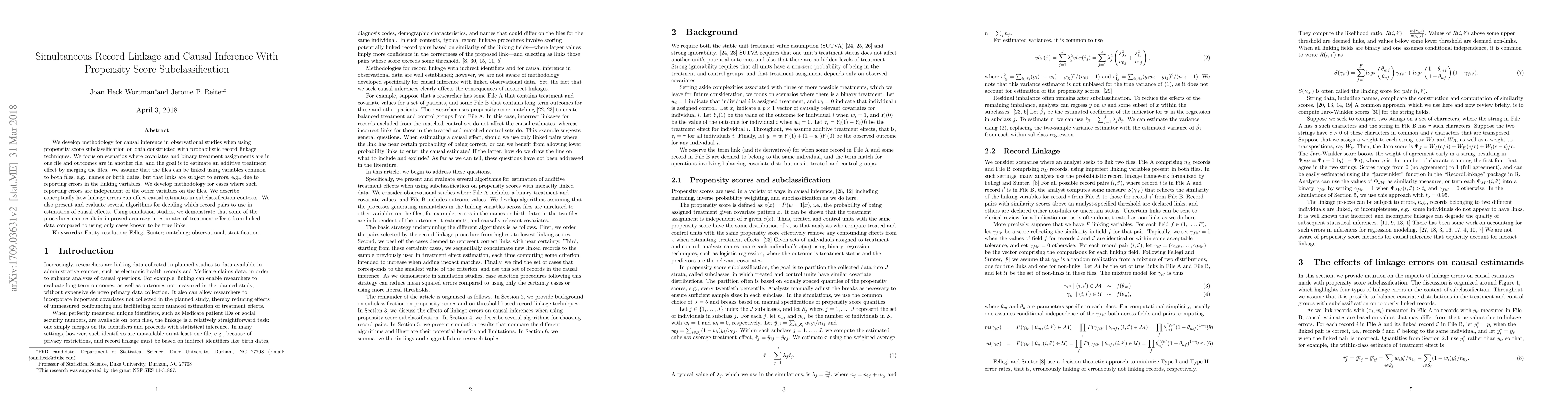 This paper introduces a methodology for causal inference in observational studies using propensity score subclassification and probabilistic record linkage, addressing scenarios where treatment data and outcomes are in separate files. The authors propose algorithms to improve the accuracy of treatment effect estimates by accounting for potential linkage errors, demonstrating their effectiveness through simulation studies.