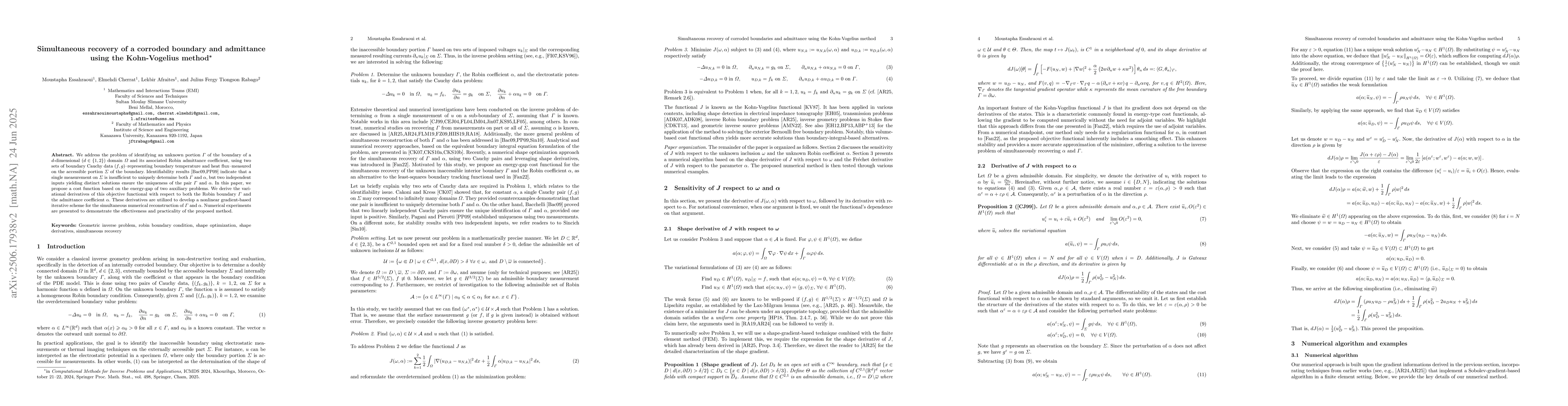 We address the problem of identifying an unknown portion $\Gamma$ of the boundary of a $d$-dimensional ($d \in \{1, 2\}$) domain $\Omega$ and its associated Robin admittance coefficient, using two sets of boundary Cauchy data $(f, g)$--representing boundary temperature and heat flux--measured on the accessible portion $\Sigma$ of the boundary. Identifiability results \cite{Bacchelli2009,PaganiPierotti2009} indicate that a single measurement on $\Sigma$ is insufficient to uniquely determine both $\Gamma$ and $\alpha$, but two independent inputs yielding distinct solutions ensure the uniqueness of the pair $\Gamma$ and $\alpha$. In this paper, we propose a cost function based on the energy-gap of two auxiliary problems. We derive the variational derivatives of this objective functional with respect to both the Robin boundary $\Gamma$ and the admittance coefficient $\alpha$. These derivatives are utilized to develop a nonlinear gradient-based iterative scheme for the simultaneous numerical reconstruction of $\Gamma$ and $\alpha$. Numerical experiments are presented to demonstrate the effectiveness and practicality of the proposed method.