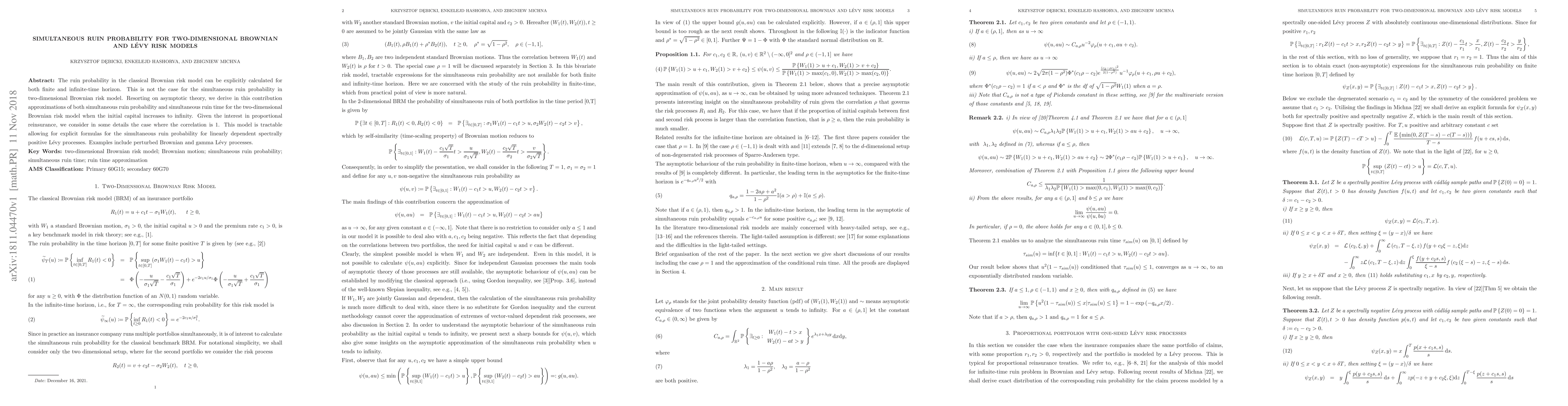 The ruin probability in the classical Brownian risk model can be explicitly calculated for both finite and infinite-time horizon. This is not the case for the simultaneous ruin probability in two-dimensional Brownian risk model. Resorting on asymptotic theory, we derive in this contribution approximations of both simultaneous ruin probability and simultaneous ruin time for the two-dimensional Brownian risk model when the initial capital increases to infinity. Given the interest in proportional reinsurance, we consider in some details the case where the correlation is 1. This model is tractable allowing for explicit formulas for the simultaneous ruin probability for linearly dependent spectrally positive L\'evy processes. Examples include perturbed Brownian and gamma L\'evy processes.