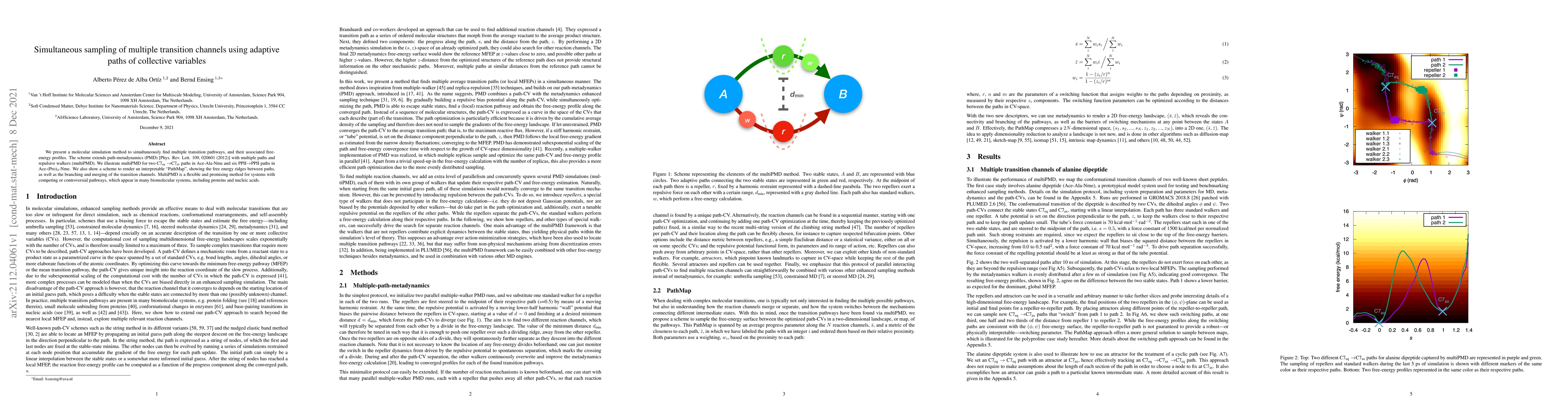 This paper introduces multiPMD, an advanced molecular simulation method that extends path-metadynamics to simultaneously explore multiple transition pathways and their free-energy profiles, illustrated through examples in peptide systems. The method also provides a "PathMap" for visualizing complex transition dynamics.