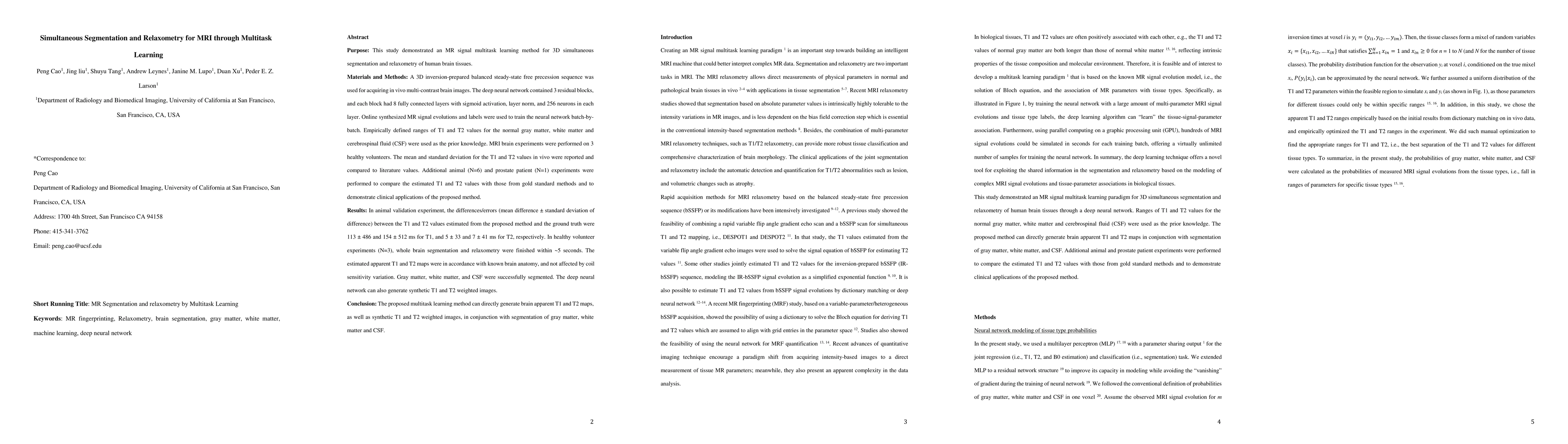 This study introduces a multitask learning method using a deep neural network for simultaneous MRI segmentation and relaxometry of brain tissues. The method accurately estimates T1 and T2 values and segments gray matter, white matter, and CSF, with minimal errors compared to ground truth values.