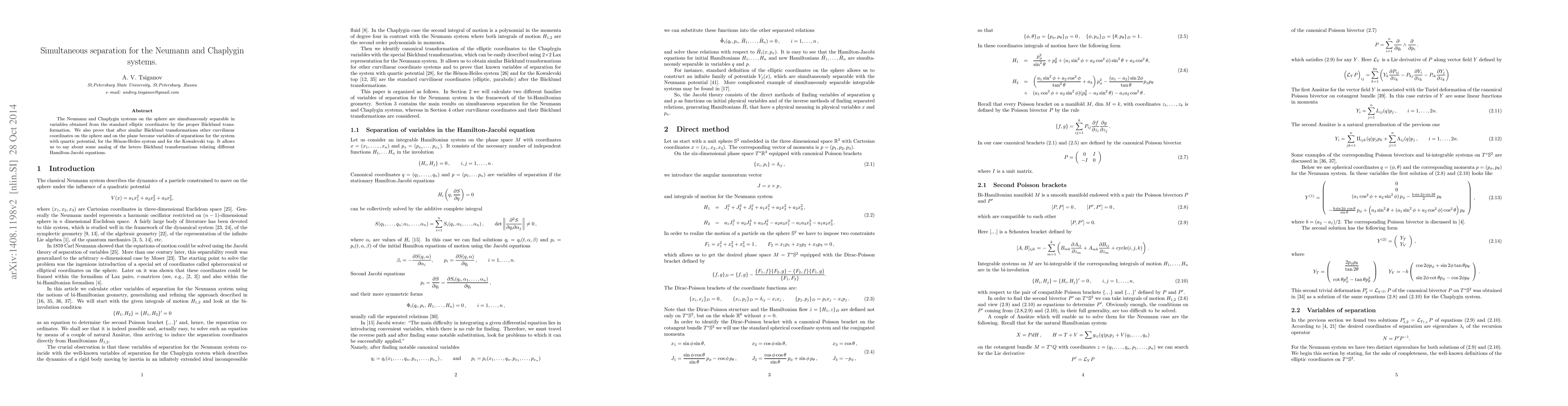 Researchers found that specific transformations can simultaneously separate variables for several complex systems, including the Neumann and Chaplygin systems, and have implications for understanding related Hamilton-Jacobi equations.