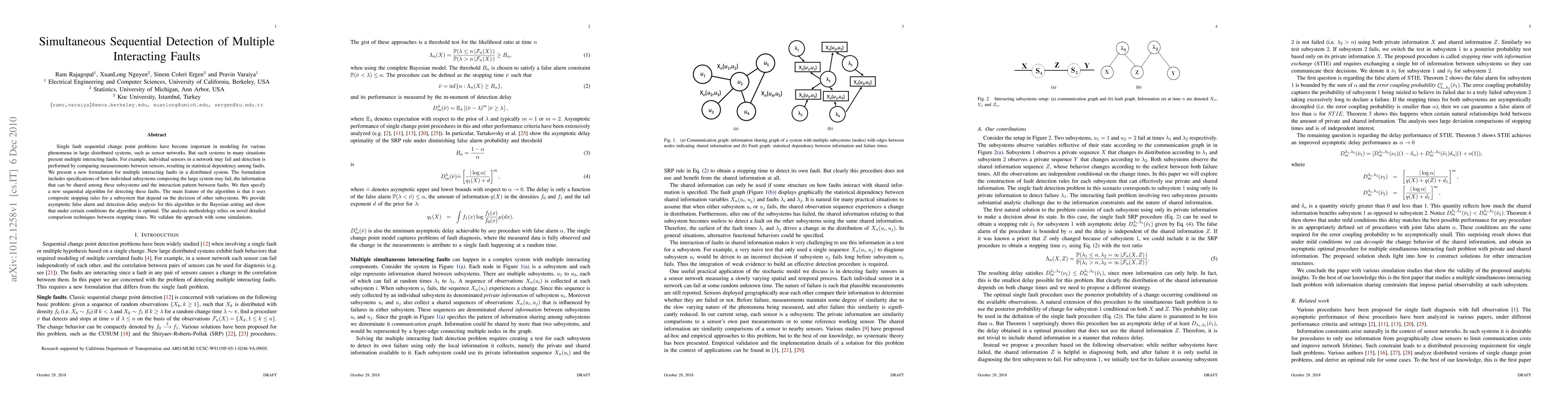 Single fault sequential change point problems have become important in modeling for various phenomena in large distributed systems, such as sensor networks. But such systems in many situations present multiple interacting faults. For example, individual sensors in a network may fail and detection is performed by comparing measurements between sensors, resulting in statistical dependency among faults. We present a new formulation for multiple interacting faults in a distributed system. The formulation includes specifications of how individual subsystems composing the large system may fail, the information that can be shared among these subsystems and the interaction pattern between faults. We then specify a new sequential algorithm for detecting these faults. The main feature of the algorithm is that it uses composite stopping rules for a subsystem that depend on the decision of other subsystems. We provide asymptotic false alarm and detection delay analysis for this algorithm in the Bayesian setting and show that under certain conditions the algorithm is optimal. The analysis methodology relies on novel detailed comparison techniques between stopping times. We validate the approach with some simulations.