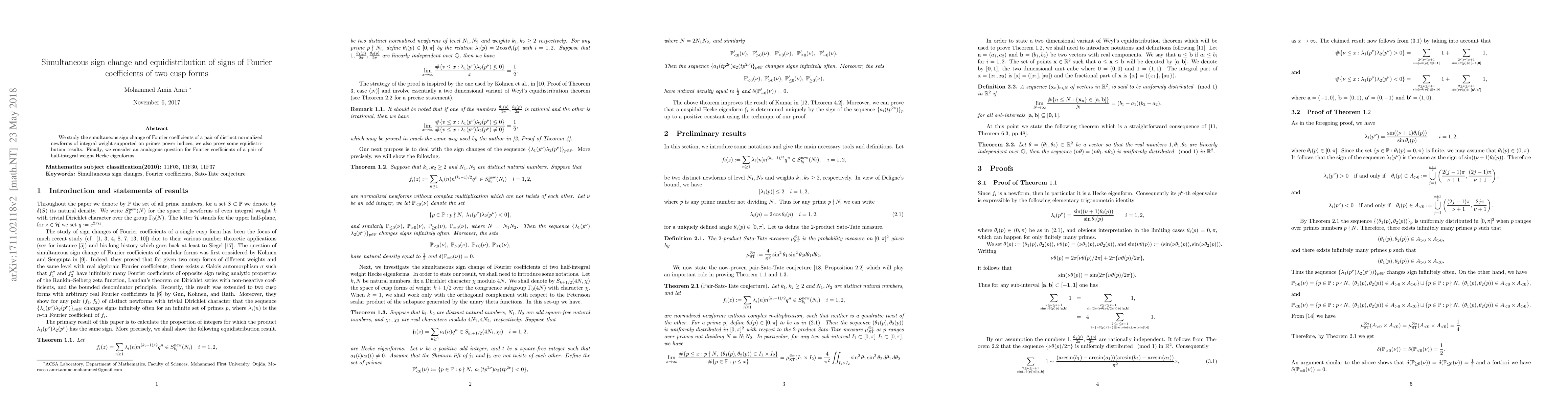 We study the simultaneous sign change of Fourier coefficients of a pair of distinct normalized newforms of integral weight supported on primes power indices, we also prove some equidistribution results. Finally, we consider an analogous question for Fourier coefficients of a pair of half-integral weight Hecke eigenforms.