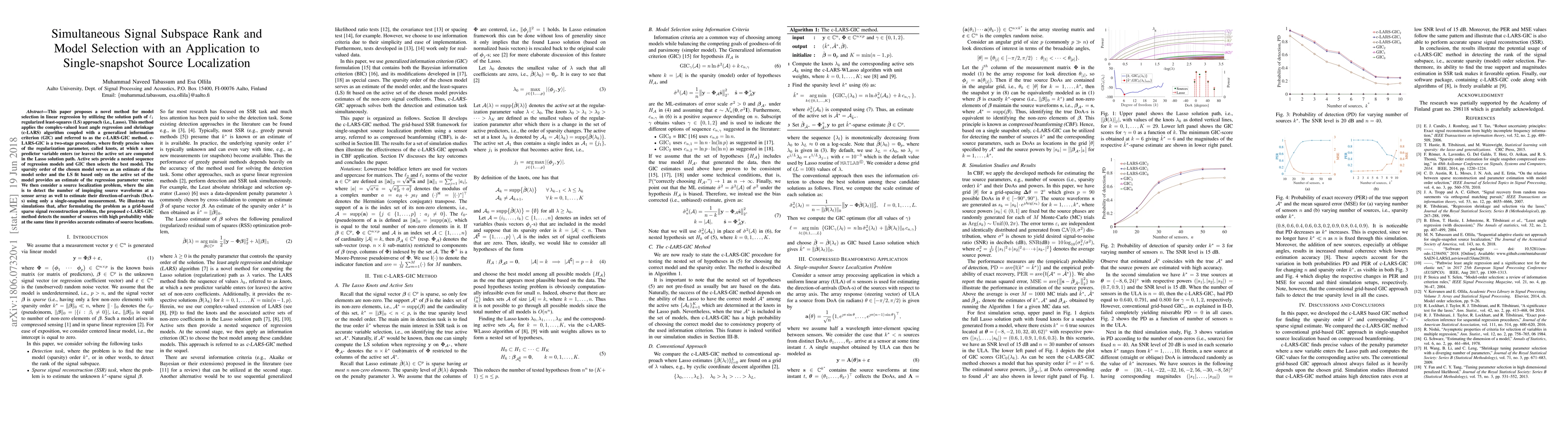 This paper introduces a c-LARS-GIC method for model selection in linear regression, utilizing the Lasso solution path and generalized information criterion to determine the optimal model. It applies this method to single-snapshot source localization, achieving accurate detection of source numbers and direction-of-arrivals.