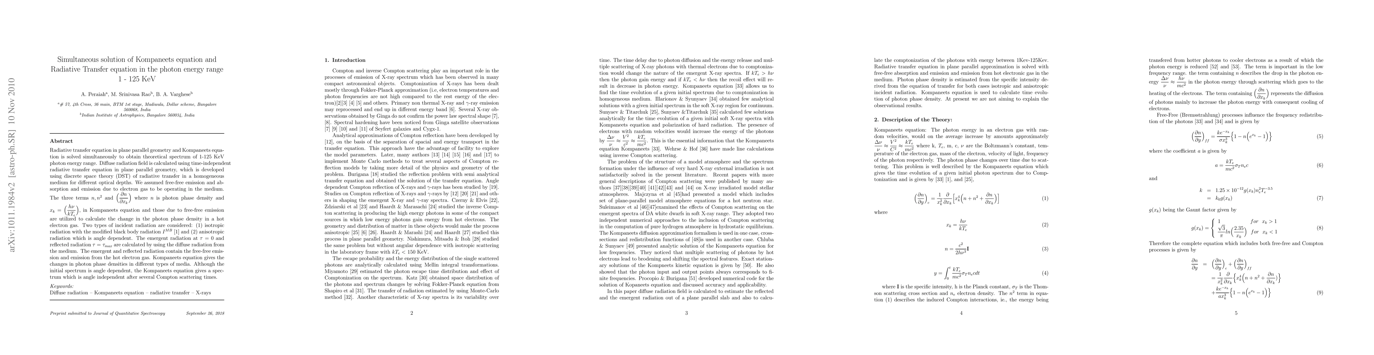 Radiative transfer equation in plane parallel geometry and Kompaneets equation is solved simultaneously to obtain theoretical spectrum of 1-125 KeV photon energy range. Diffuse radiation field is calculated using time-independent radiative transfer equation in plane parallel geometry, which is developed using discrete space theory (DST) of radiative transfer in a homogeneous medium for different optical depths. We assumed free-free emission and absorption and emission due to electron gas to be operating in the medium. The three terms $n, n^2$ and $\displaystyle \bigg({\frac {\partial n}{\partial x_k}}\bigg)$ where $n$ is photon phase density and $\displaystyle x_k= \bigg({\frac {h \nu} {k T_e}} \bigg) $, in Kompaneets equation and those due to free-free emission are utilized to calculate the change in the photon phase density in a hot electron gas. Two types of incident radiation are considered: (1) isotropic radiation with the modified black body radiation $I^{MB}$ [1] and (2) anisotropic radiation which is angle dependent. The emergent radiation at $\tau=0$ and reflected radiation $\tau=\tau_{max}$ are calculated by using the diffuse radiation from the medium. The emergent and reflected radiation contain the free-free emission and emission from the hot electron gas. Kompaneets equation gives the changes in photon phase densities in different types of media. Although the initial spectrum is angle dependent, the Kompaneets equation gives a spectrum which is angle independent after several Compton scattering times.