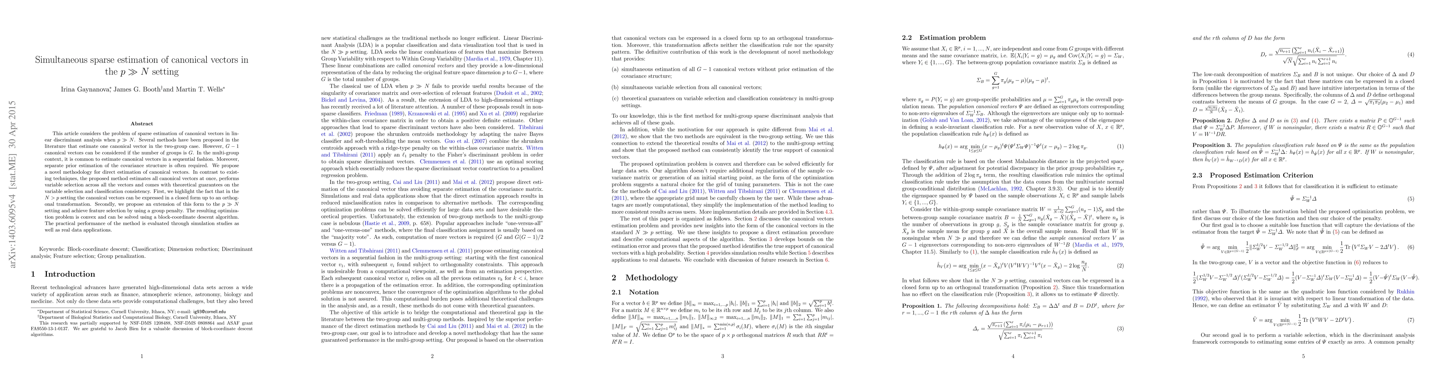 This article considers the problem of sparse estimation of canonical vectors in linear discriminant analysis when $p\gg N$. Several methods have been proposed in the literature that estimate one canonical vector in the two-group case. However, $G-1$ canonical vectors can be considered if the number of groups is $G$. In the multi-group context, it is common to estimate canonical vectors in a sequential fashion. Moreover, separate prior estimation of the covariance structure is often required. We propose a novel methodology for direct estimation of canonical vectors. In contrast to existing techniques, the proposed method estimates all canonical vectors at once, performs variable selection across all the vectors and comes with theoretical guarantees on the variable selection and classification consistency. First, we highlight the fact that in the $N>p$ setting the canonical vectors can be expressed in a closed form up to an orthogonal transformation. Secondly, we propose an extension of this form to the $p\gg N$ setting and achieve feature selection by using a group penalty. The resulting optimization problem is convex and can be solved using a block-coordinate descent algorithm. The practical performance of the method is evaluated through simulation studies as well as real data applications.
