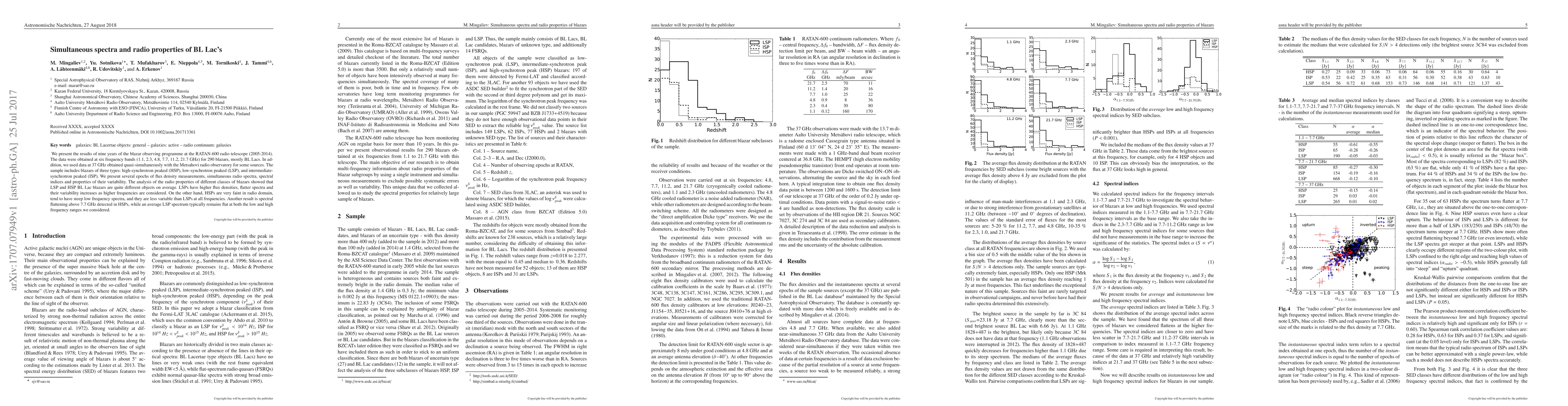 We present the results of nine years of the blazar observing programme at the RATAN-600 radio telescope (2005-2014). The data were obtained at six frequency bands (1.1, 2.3, 4.8, 7.7, 11.2, 21.7 GHz) for 290 blazars, mostly BL Lacs. In addition, we used data at 37 GHz obtained quasi-simultaneously with the Metsahovi radio observatory for some sources. The sample includes blazars of three types: high-synchrotron peaked (HSP), low-synchrotron peaked (LSP), and intermediate-synchrotron peaked (ISP). We present several epochs of flux density measurements, simultaneous radio spectra, spectral indices and properties of their variability. The analysis of the radio properties of different classes of blazars showed that LSP and HSP BL Lac blazars are quite different objects on average. LSPs have higher flux densities, flatter spectra and their variability increases as higher frequencies are considered. On the other hand, HSPs are very faint in radio domain, tend to have steep low frequency spectra, and they are less variable than LSPs at all frequencies. Another result is spectral flattening above 7.7 GHz detected in HSPs, while an average LSP spectrum typically remains flat at both the low and high frequency ranges we considered.