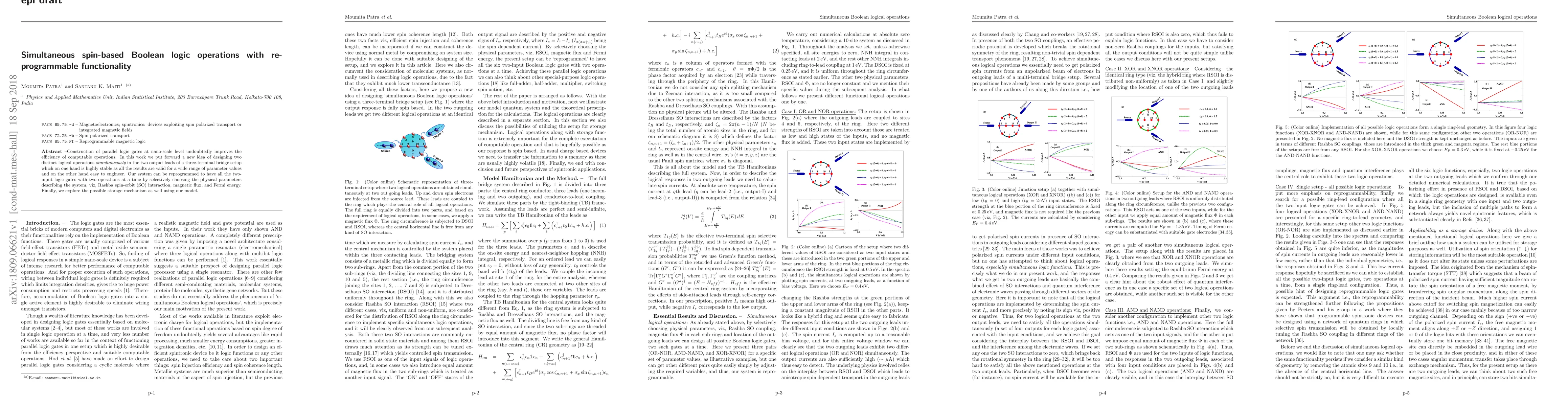 Construction of parallel logic gates at nano-scale level undoubtedly improves the efficiency of computable operations. In this work we put forward a new idea of designing two distinct logical operations {\em simultaneously} in the two output leads of a three-terminal bridge setup which on one hand is highly stable as all the results are valid for a wide range of parameter values and on the other hand easy to engineer. Our system can be reprogrammed to have all the two-input logic gates with two operations at a time by selectively choosing the physical parameters describing the system, viz, Rashba spin-orbit (SO) interaction, magnetic flux, and Fermi energy. Finally, we explore the possible storage mechanism as well using our model.