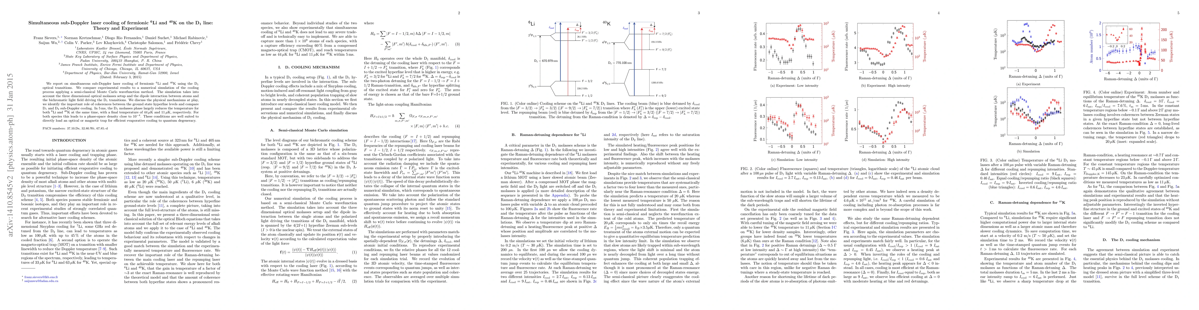 The paper presents simultaneous sub-Doppler laser cooling of fermionic $^6$Li and $^{40}$K using the D$_1$ optical transitions. Experiments confirm theoretical predictions via a semi-classical Monte Carlo wavefunction method, showing both species reach temperatures of 44 $mu$K and 11 $mu$K respectively in 5 ms, enabling high phase-space density for efficient loading into traps for further cooling.