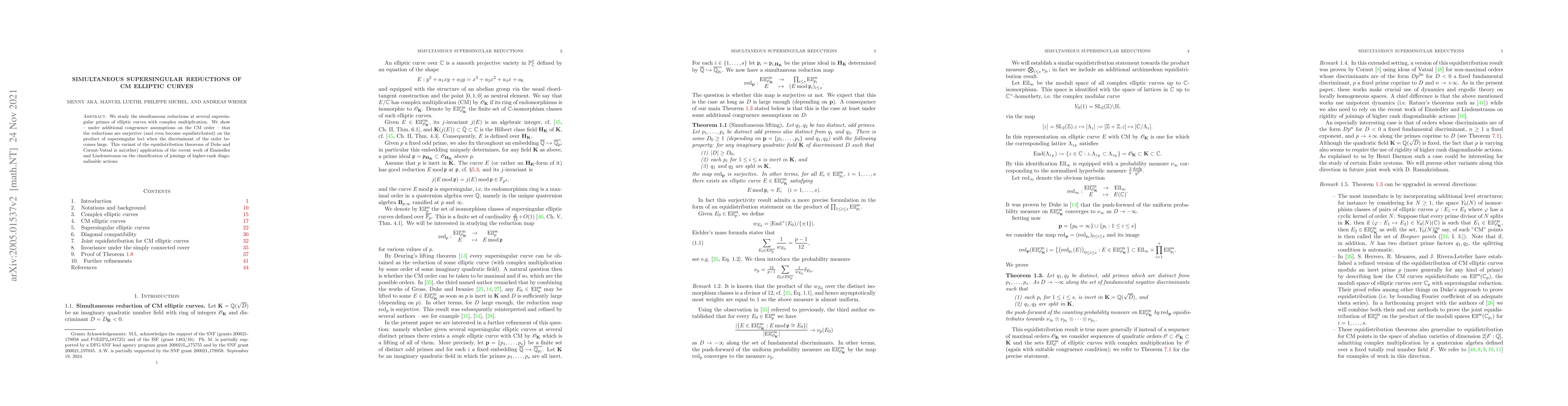 The paper presents a detailed analysis of the simultaneous reduction behavior of CM elliptic curves, leveraging advanced techniques from ergodic theory and the classification of joinings to prove surjectivity and equidistribution under congruence conditions.