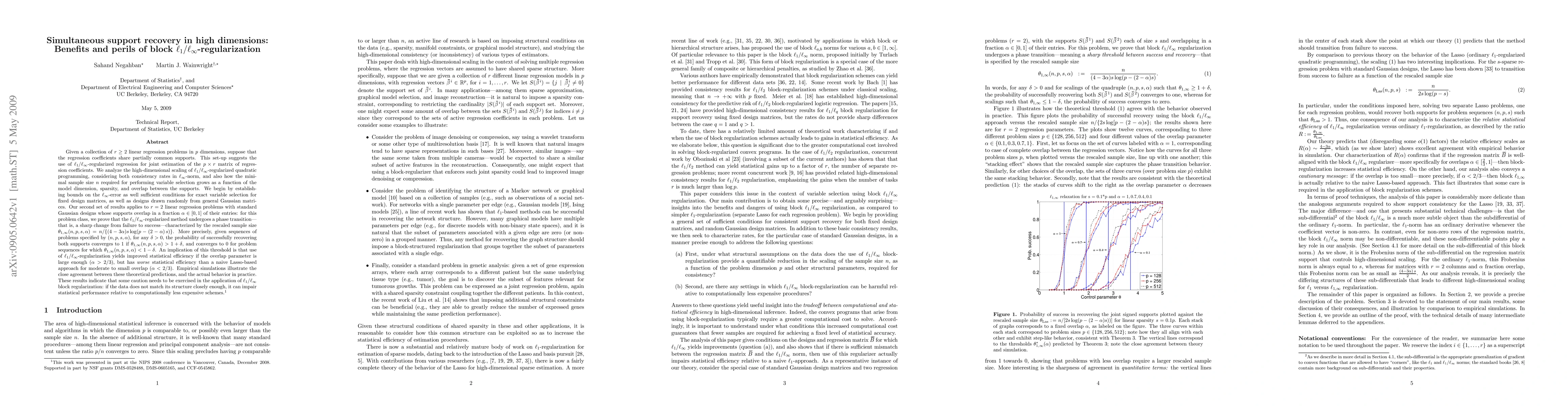 Consider the use of $\ell_{1}/\ell_{\infty}$-regularized regression for joint estimation of a $\pdim \times \numreg$ matrix of regression coefficients. We analyze the high-dimensional scaling of $\ell_1/\ell_\infty$-regularized quadratic programming, considering both consistency in $\ell_\infty$-norm, and variable selection. We begin by establishing bounds on the $\ell_\infty$-error as well sufficient conditions for exact variable selection for fixed and random designs. Our second set of results applies to $\numreg = 2$ linear regression problems with standard Gaussian designs whose supports overlap in a fraction $\alpha \in [0,1]$ of their entries: for this problem class, we prove that the $\ell_{1}/\ell_{\infty}$-regularized method undergoes a phase transition--that is, a sharp change from failure to success--characterized by the rescaled sample size $\theta_{1,\infty}(n, p, s, \alpha) = n/\{(4 - 3 \alpha) s \log(p-(2- \alpha) s)\}$. An implication of this threshold is that use of $\ell_1 / \ell_{\infty}$-regularization yields improved statistical efficiency if the overlap parameter is large enough ($\alpha > 2/3$), but has \emph{worse} statistical efficiency than a naive Lasso-based approach for moderate to small overlap ($\alpha < 2/3$). These results indicate that some caution needs to be exercised in the application of $\ell_1/\ell_\infty$ block regularization: if the data does not match its structure closely enough, it can impair statistical performance relative to computationally less expensive schemes.