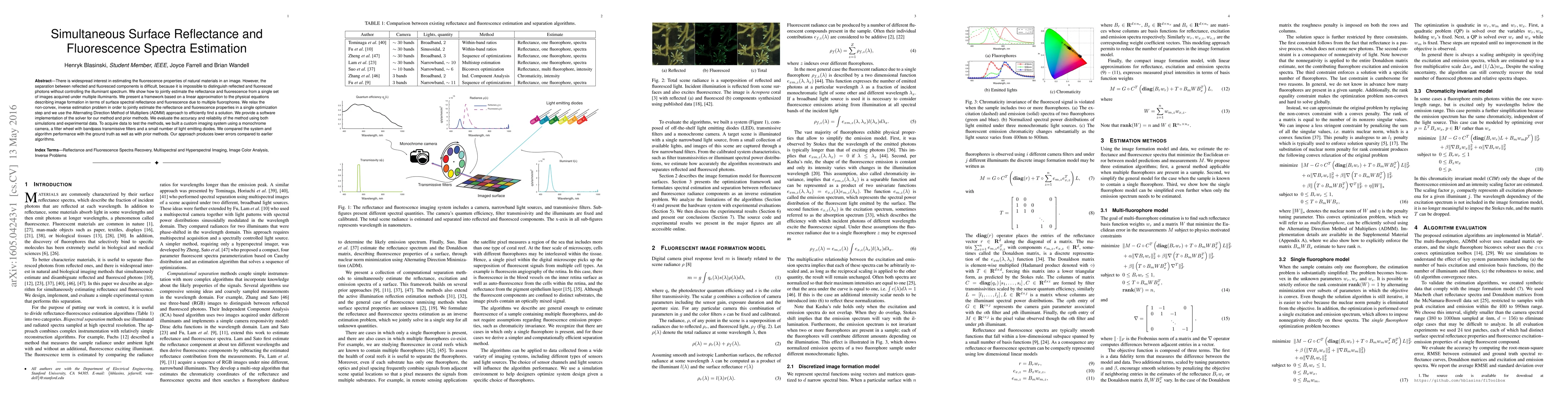There is widespread interest in estimating the fluorescence properties of natural materials in an image. However, the separation between reflected and fluoresced components is difficult, because it is impossible to distinguish reflected and fluoresced photons without controlling the illuminant spectrum. We show how to jointly estimate the reflectance and fluorescence from a single set of images acquired under multiple illuminants. We present a framework based on a linear approximation to the physical equations describing image formation in terms of surface spectral reflectance and fluorescence due to multiple fluorophores. We relax the non-convex, inverse estimation problem in order to jointly estimate the reflectance and fluorescence properties in a single optimization step and we use the Alternating Direction Method of Multipliers (ADMM) approach to efficiently find a solution. We provide a software implementation of the solver for our method and prior methods. We evaluate the accuracy and reliability of the method using both simulations and experimental data. To acquire data to test the methods, we built a custom imaging system using a monochrome camera, a filter wheel with bandpass transmissive filters and a small number of light emitting diodes. We compared the system and algorithm performance with the ground truth as well as with prior methods. Our approach produces lower errors compared to earlier algorithms.