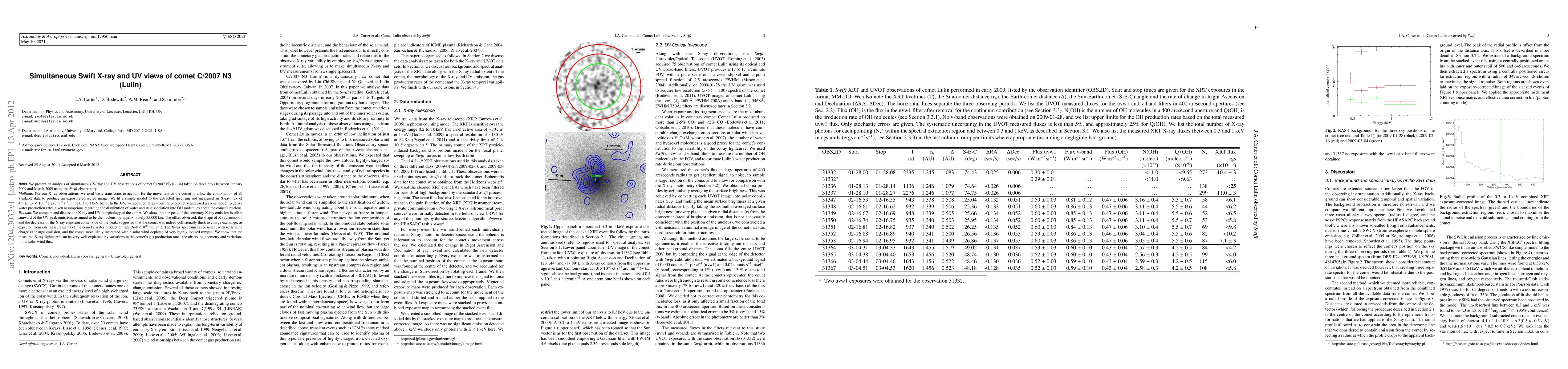 This study uses Swift observatory data to simultaneously analyze X-ray and UV emissions from comet C/2007 N3 (Lulin), revealing an X-ray flux of 4.3±1.3 × 10^-13 ergs cm^-2 s^-1. The X-ray peak is offset from the UV peak by about 35,000 km, indicating a collisionally thick comet and supporting solar wind charge exchange as the X-ray source.