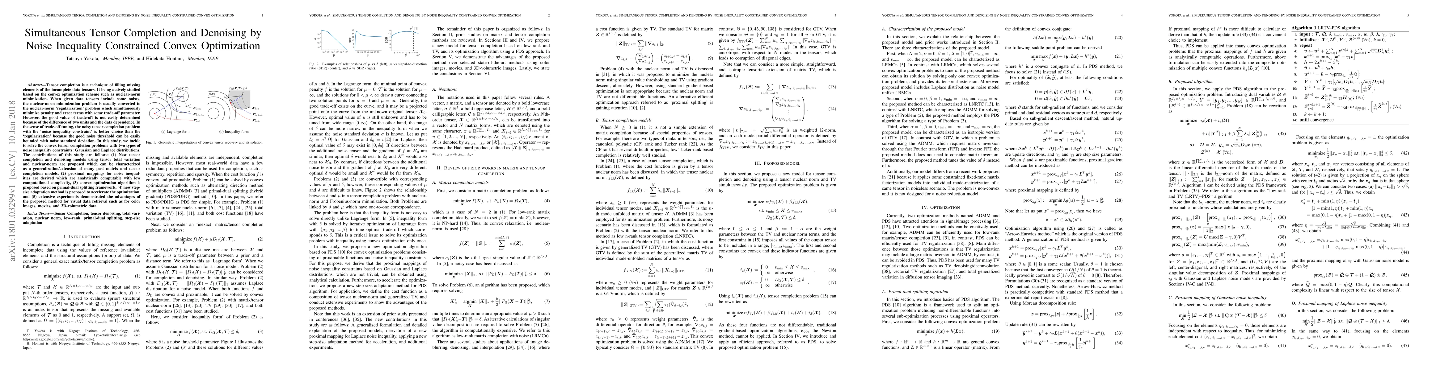 This paper proposes a novel convex optimization method for tensor completion and denoising using noise inequality constraints. It introduces new tensor completion and denoising models, derives proximal mappings for noise inequalities, and presents a convex optimization algorithm with a step-size adaptation method. Experiments show the effectiveness of the method for visual data retrieval, including color images, movies, and 3D-volumetric data.