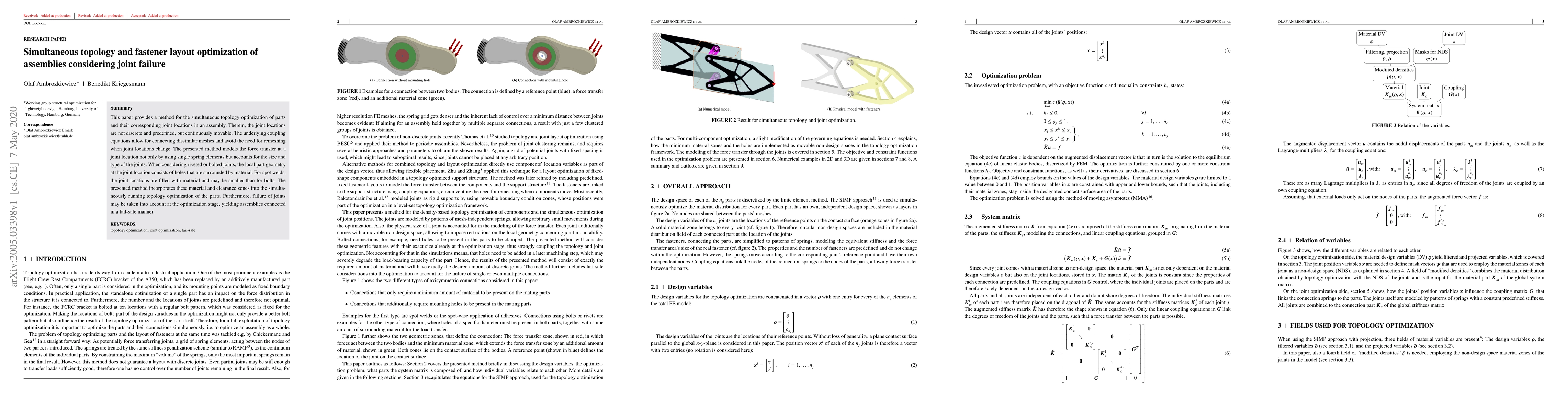 This paper presents a method for optimizing both the topology of parts and their joint locations in assemblies, allowing for continuous joint movement and modeling force transfer based on joint type. The method incorporates material and clearance zones for different joint types into the optimization, aiming to create fail-safe assemblies.