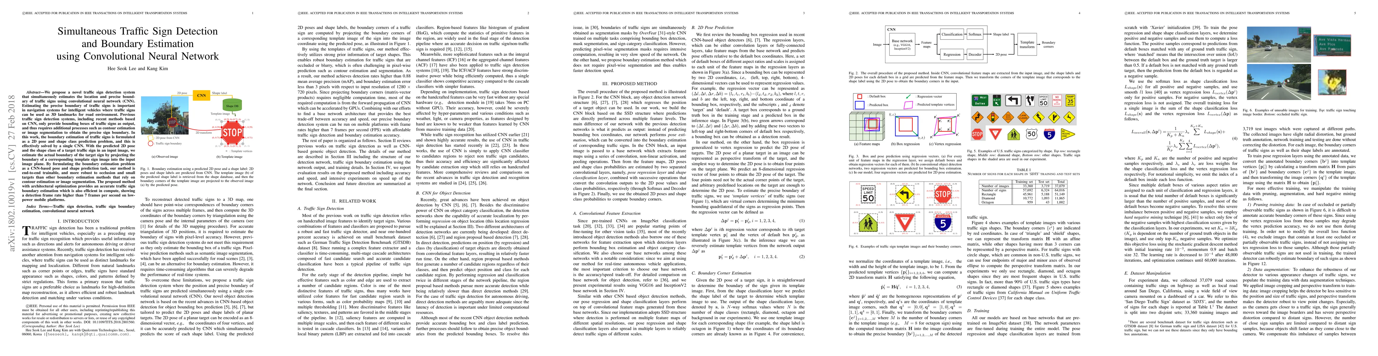 This paper proposes a CNN-based system for simultaneous traffic sign detection and precise boundary estimation, addressing the limitation of previous methods that require additional contour estimation. The method formulates boundary estimation as a 2D pose and shape class prediction, achieving end-to-end training and robust performance, with a detection frame rate exceeding 7 FPS on mobile platforms.