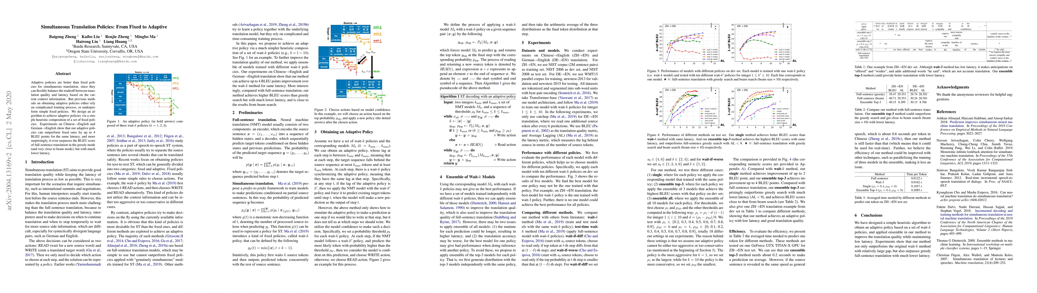 This paper proposes an adaptive simultaneous translation algorithm that outperforms fixed policies by flexibly balancing translation quality and latency through heuristic composition of fixed policies. Experimental results show significant improvements in BLEU scores, outperforming both fixed policies and full-sentence translation methods with lower latency.