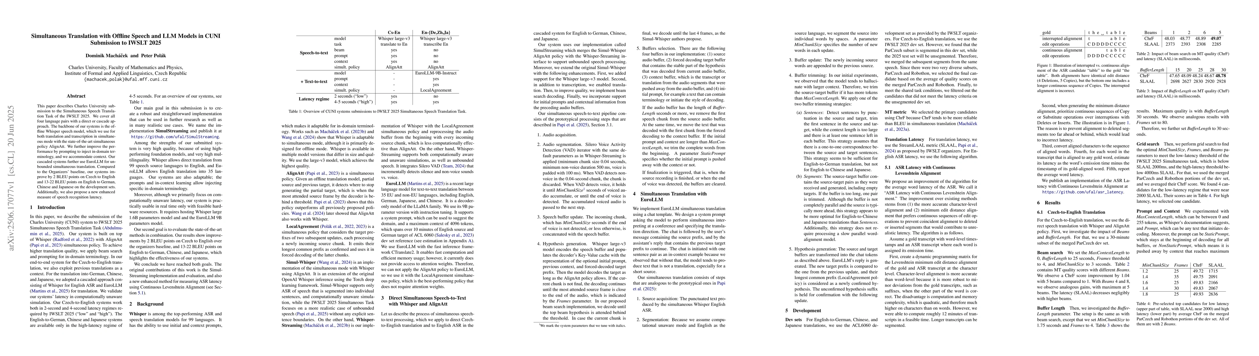 This paper describes Charles University submission to the Simultaneous Speech Translation Task of the IWSLT 2025. We cover all four language pairs with a direct or cascade approach. The backbone of our systems is the offline Whisper speech model, which we use for both translation and transcription in simultaneous mode with the state-of-the-art simultaneous policy AlignAtt. We further improve the performance by prompting to inject in-domain terminology, and we accommodate context. Our cascaded systems further use EuroLLM for unbounded simultaneous translation. Compared to the Organizers' baseline, our systems improve by 2 BLEU points on Czech to English and 13-22 BLEU points on English to German, Chinese and Japanese on the development sets. Additionally, we also propose a new enhanced measure of speech recognition latency.