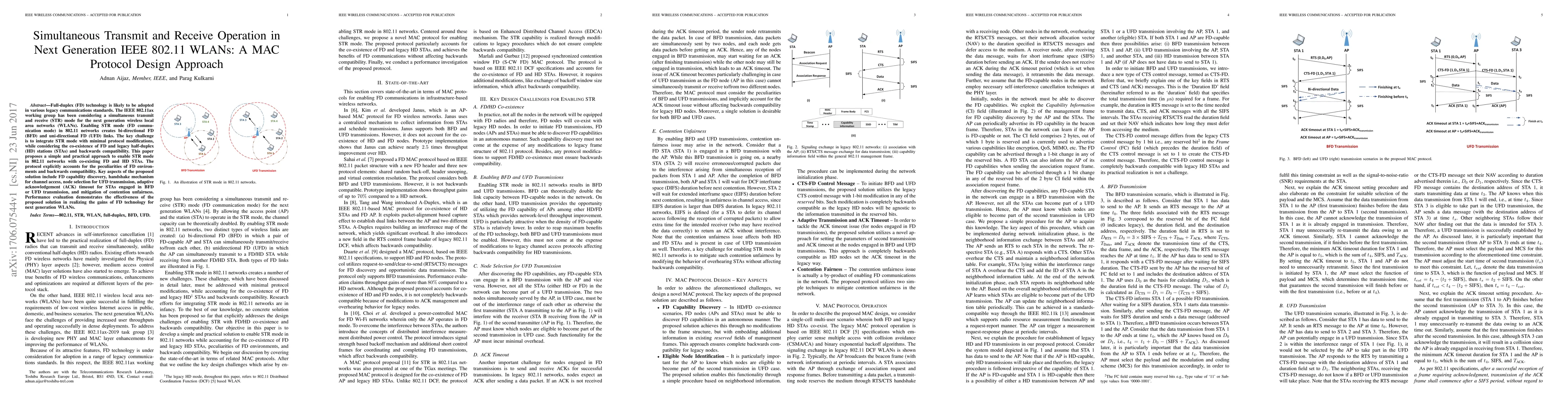 This paper proposes a MAC protocol design to enable simultaneous transmit and receive (STR) in next-generation IEEE 802.11 WLANs, addressing the integration of full-duplex (FD) communication with minimal protocol modifications and co-existence with legacy half-duplex stations. The solution includes FD capability discovery, adaptive mechanisms, and performance evaluation showing its effectiveness.