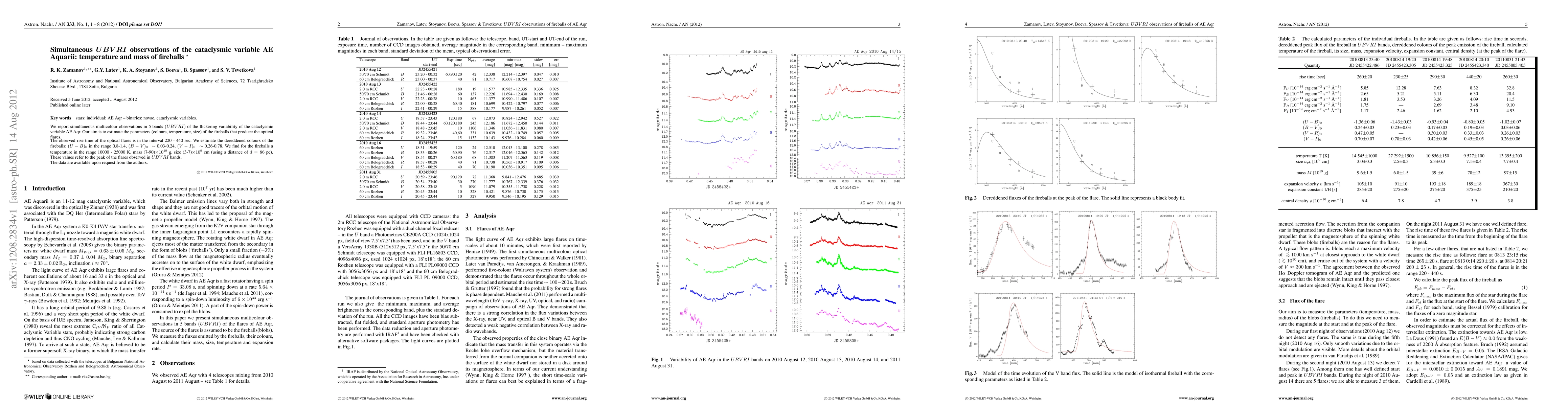 We report simultaneous multicolour observations in 5 bands (UBVRI) of the flickering variability of the cataclysmic variable AE Aqr. Our aim is to estimate the parameters (colours, temperature, size) of the fireballs that produce the optical flares. The observed rise time of the optical flares is in the interval 220 - 440 sec. We estimate the dereddened colours of the fireballs: (U-B)_0 in the range 0.8-1.4, (B-V)_0 ~ 0.03-0.24, (V-I)_0 ~ 0.26-0.78. We find for the fireballs a temperature in the range 10000 - 25000 K, mass (7-90).10^{19} g, size (3-7).10^9 cm (using a distance of d=86 pc). These values refer to the peak of the flares observed in UBVRI bands. The data are available upon request from the authors.