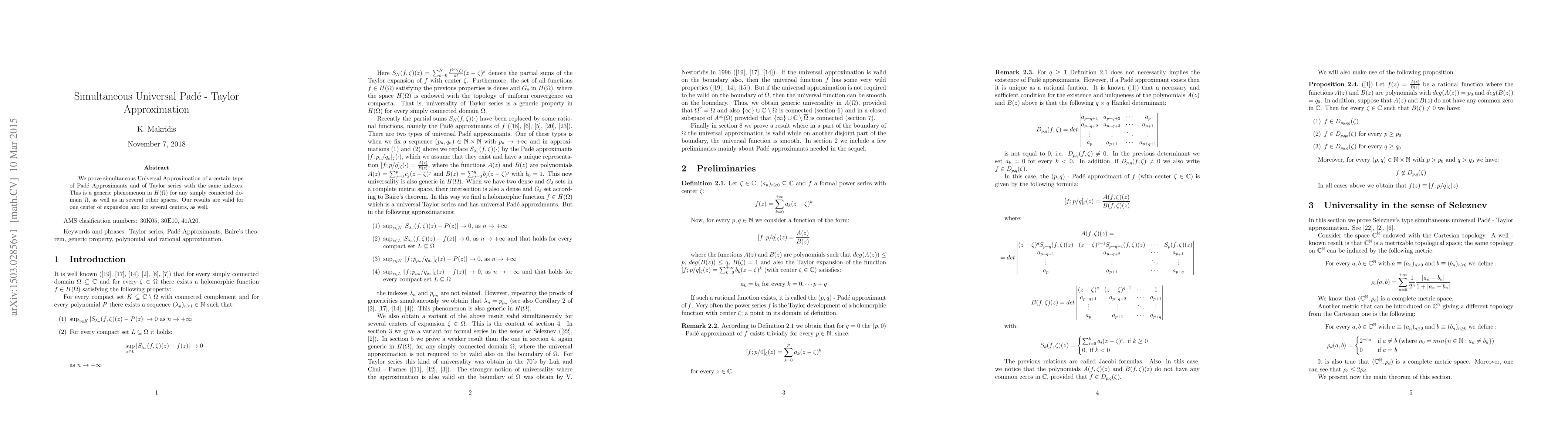 We prove simultaneous Universal Approximation of a certain type of Pade Approximants and of Taylor series with the same indexes. This is a generic phenomenon in the space of holomorphic functions in any simply connected domain, as well as in several other spaces. Our results are valid for one center of expansion and for several centers, as well.