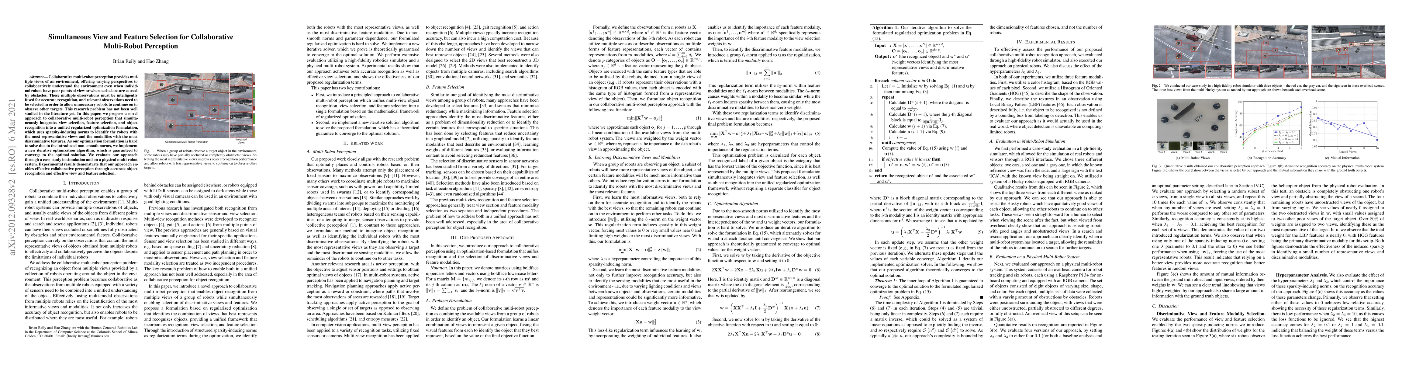 Collaborative multi-robot perception provides multiple views of an environment, offering varying perspectives to collaboratively understand the environment even when individual robots have poor points of view or when occlusions are caused by obstacles. These multiple observations must be intelligently fused for accurate recognition, and relevant observations need to be selected in order to allow unnecessary robots to continue on to observe other targets. This research problem has not been well studied in the literature yet. In this paper, we propose a novel approach to collaborative multi-robot perception that simultaneously integrates view selection, feature selection, and object recognition into a unified regularized optimization formulation, which uses sparsity-inducing norms to identify the robots with the most representative views and the modalities with the most discriminative features. As our optimization formulation is hard to solve due to the introduced non-smooth norms, we implement a new iterative optimization algorithm, which is guaranteed to converge to the optimal solution. We evaluate our approach through a case-study in simulation and on a physical multi-robot system. Experimental results demonstrate that our approach enables effective collaborative perception through accurate object recognition and effective view and feature selection.